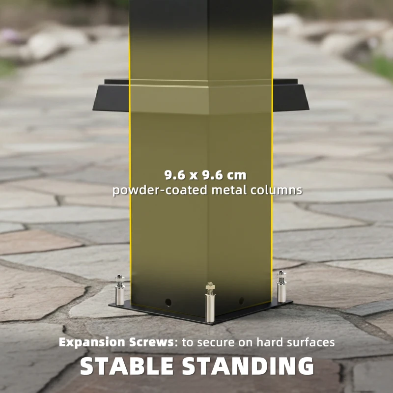 Robust frame: Built with 9.6 x 9.6 cm thick columns with powder coating, this louvered pergola canopy offers unmatched stability. Supplied with 16 expansion screws for secure fixing on hard ground, it remains steady in winds up to level 6