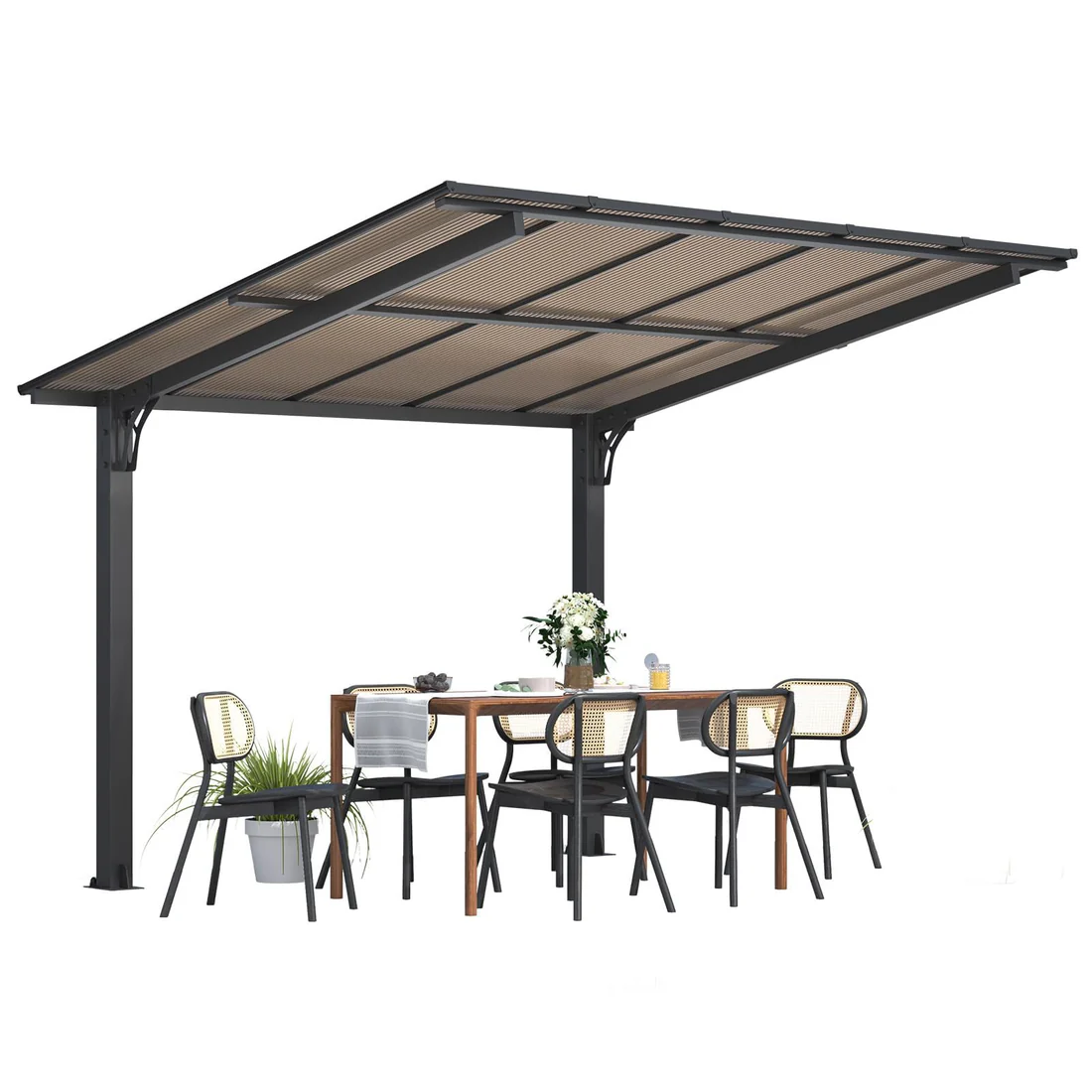 Unlike traditional wall-mounted pergolas, this gazebo is securely anchored to the ground using sturdy wooden stakes, providing stable support even without a wall.