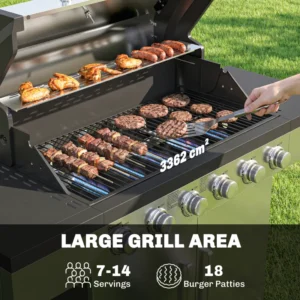 Spacious grilling area: Grill up to 18 burger patties at once on a 3362 cm² cooking surface, complemented by a warming rack. Perfect for preparing meals for 8 to 14 people with ease.