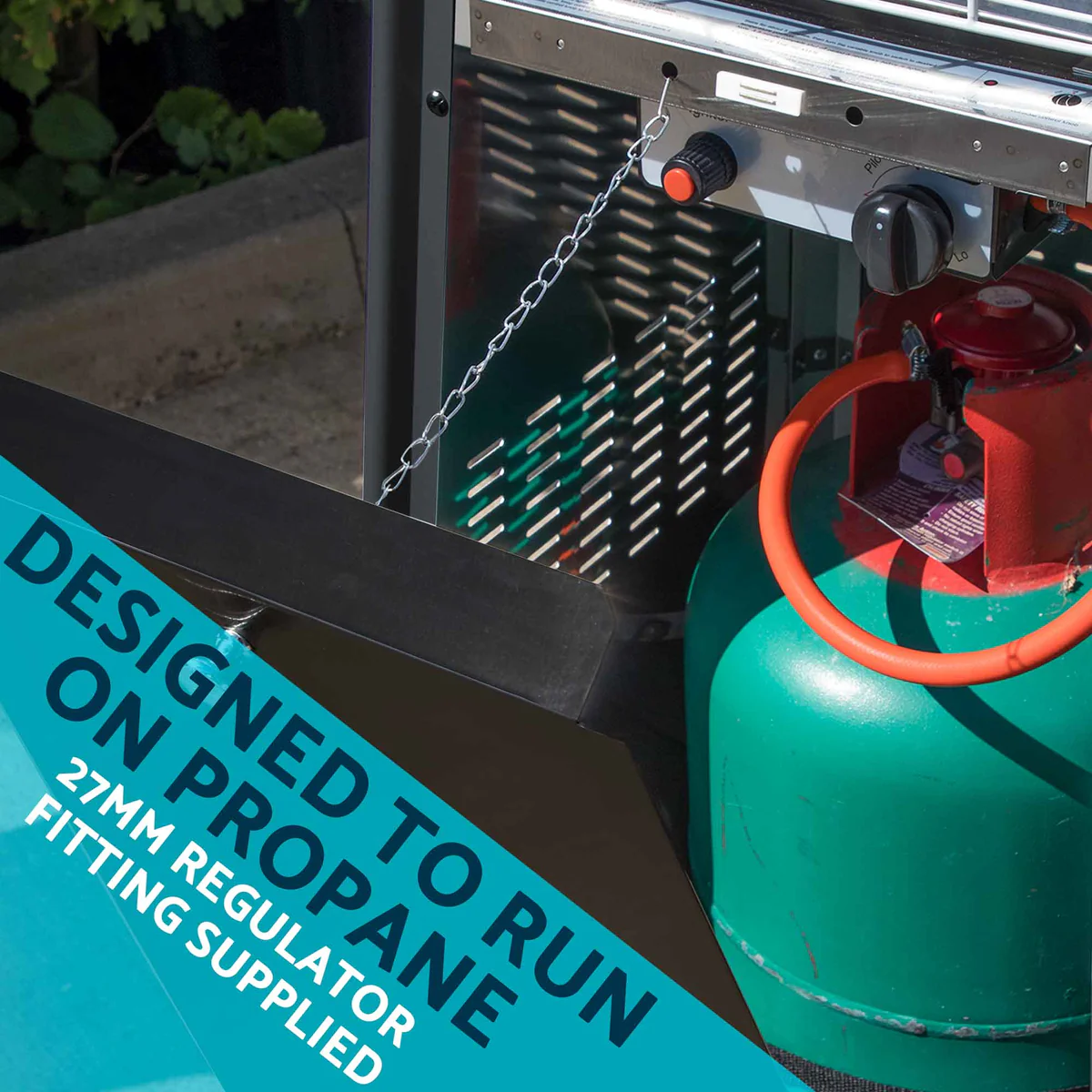 Supplied with 27mm regulator and hose assembly for use with propane patio gas bottles