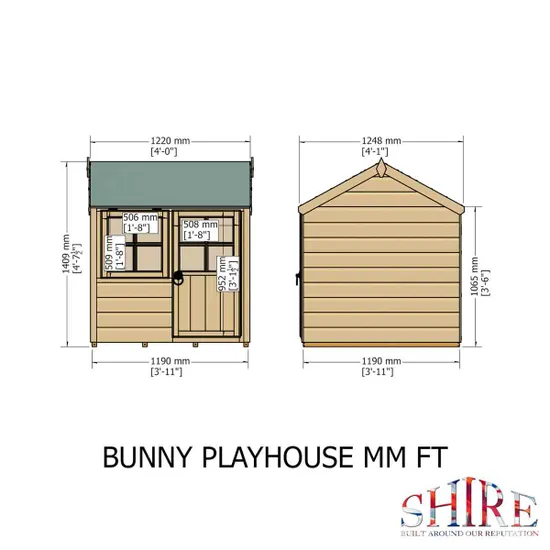 Mineral roofing felt and Perspex® safety windows are included as standard. The Shire Bunny Playhouse has been manufactured using smooth planed white pine from sustainable forests, and is available in 1 size; 4×4. It has 12mm shiplap weatherboarding on the walls, 35x35mm framing, 11mm OSB roof and floor, and opening mortice & tenon window as standard. This playhouse has been manufactured to British Standard BS5665 EN71 for your child’s safety.