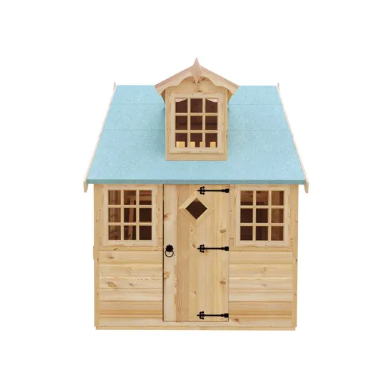 Crafted from high-grade, sustainably sourced northern European pine, this playhouse is both beautiful and eco-friendly. The door is equipped with a child-safe full-length piano hinge to protect tiny fingers. With its mock antique hinges and diamond window detailing, it adds a touch of elegance to any garden. Pre-treated with a base coat preservative, it’s ready for your child’s personal touch with their choice of paint.