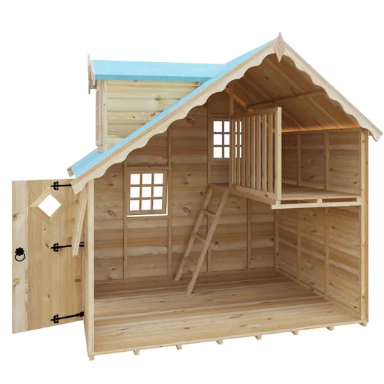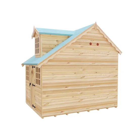 Perfect for tea parties, storytime, and endless play, this charming cottage is designed to captivate young minds. Featuring five glazed windows, including one that opens, it bathes the interior in natural light. The unique dormer window offers a delightful view from the ‘upstairs’ area, complete with a balustrade, ladder, and bannister rail, creating a magical retreat for your little ones.
