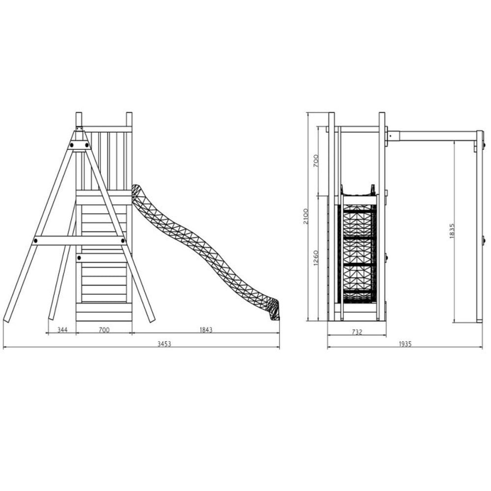 This robust timber play set, featuring a tower, ladder, rock climbing wall, slide, and swing, promises endless excitement for young explorers.