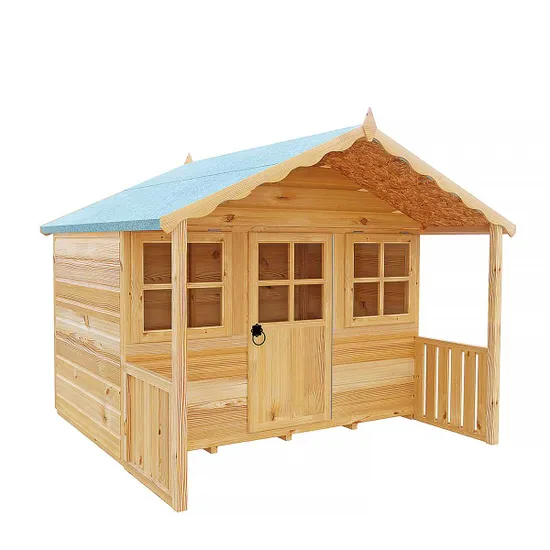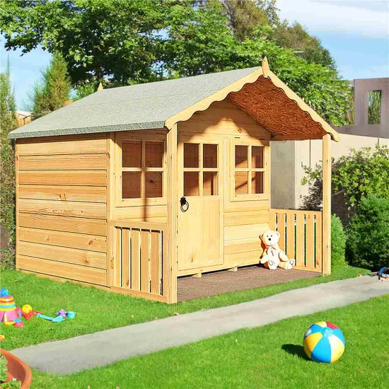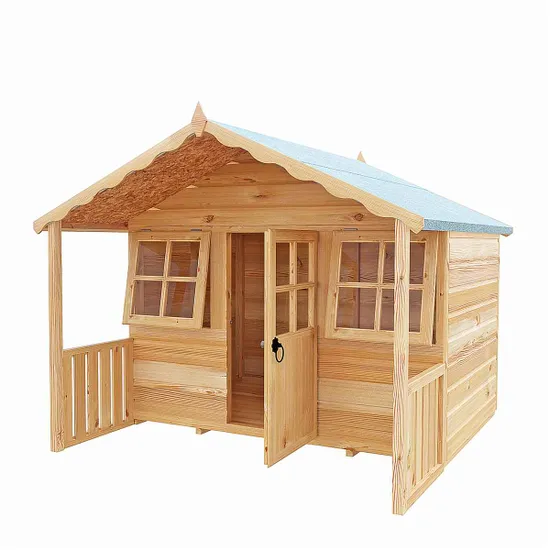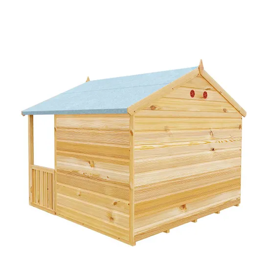 A very pretty playhouse featuring a large veranda and attractively shaped facias. It’s a safe environment with windows letting in plenty of light through styrene glazing, and in warm weather the children can play on the sheltered frontage under the pretty facia of a felt covered roof.