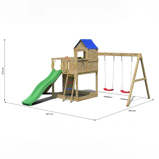 The thrilling descent down the slide guarantees an adrenaline rush, filling young adventurers with excitement at each swift transition. The double swings provide a dual dose of fun, allowing children to revel in the sensation of soaring through the open air.