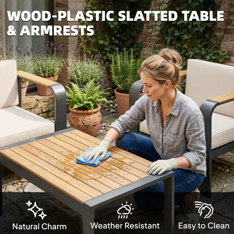 Stylish wood-plastic material: Wide armrests and the slatted coffee table top are made of PS wood-plastic, offering a warm wood look. Splash- and crack-resistant, this material is also easy to clean, keeping your garden sofa set ready for any gathering
