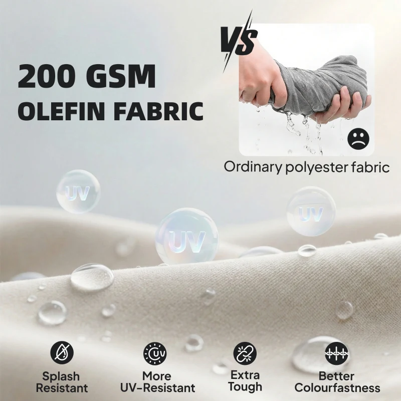 Upgraded cushion comfort: Sink into seat & back cushions on your patio furniture set. The linen-like 200gsm Olefin fabric resists fading, with washable, zipped covers that stay securely in place thanks to built-in ties, so your seating always feels fresh