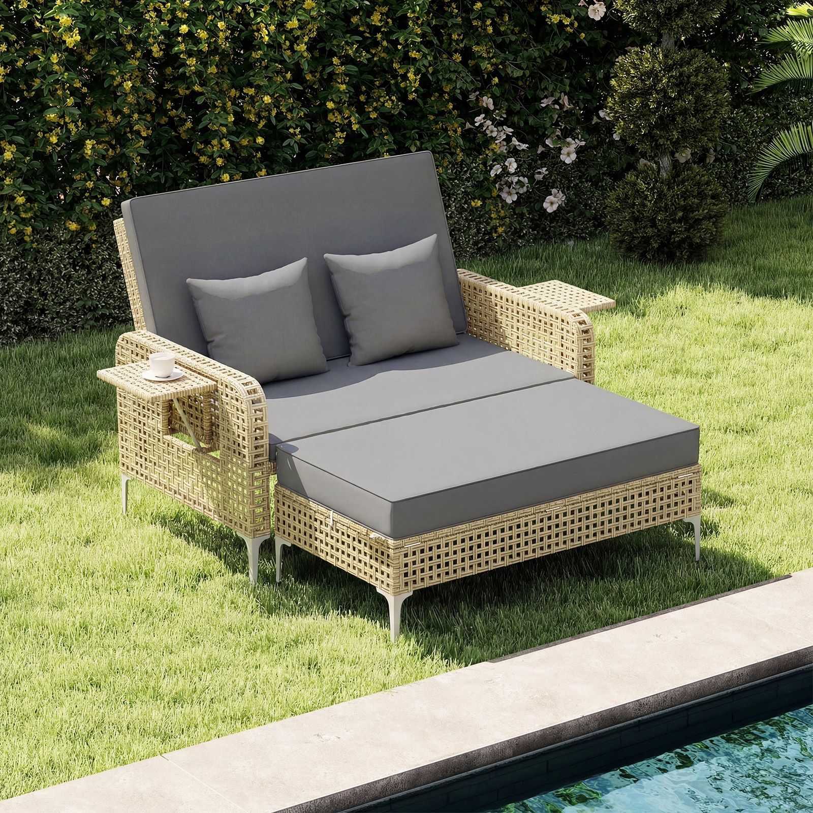 Practical Storage Ottoman: This wicker double sunbed includes an ottoman that offers a hidden flip-top compartment supported by gas struts for storing cushions, blankets, or other accessories, boasting a removable liner bag for simple upkeep. Enhancing its versatility, the storage ottoman also functions as a footrest, extra seat or table.