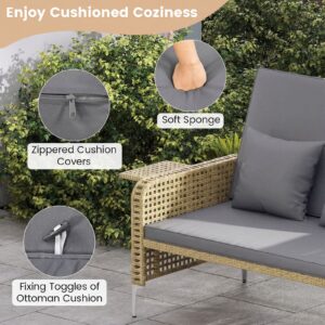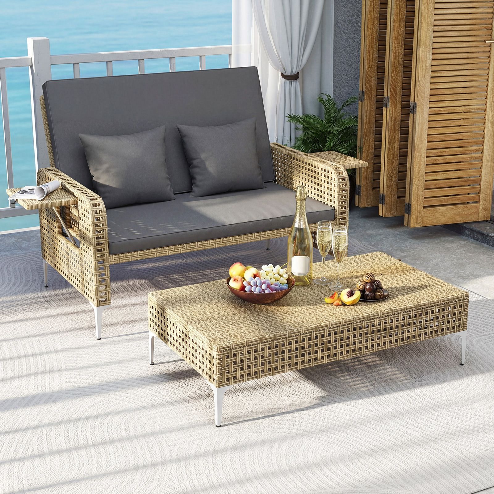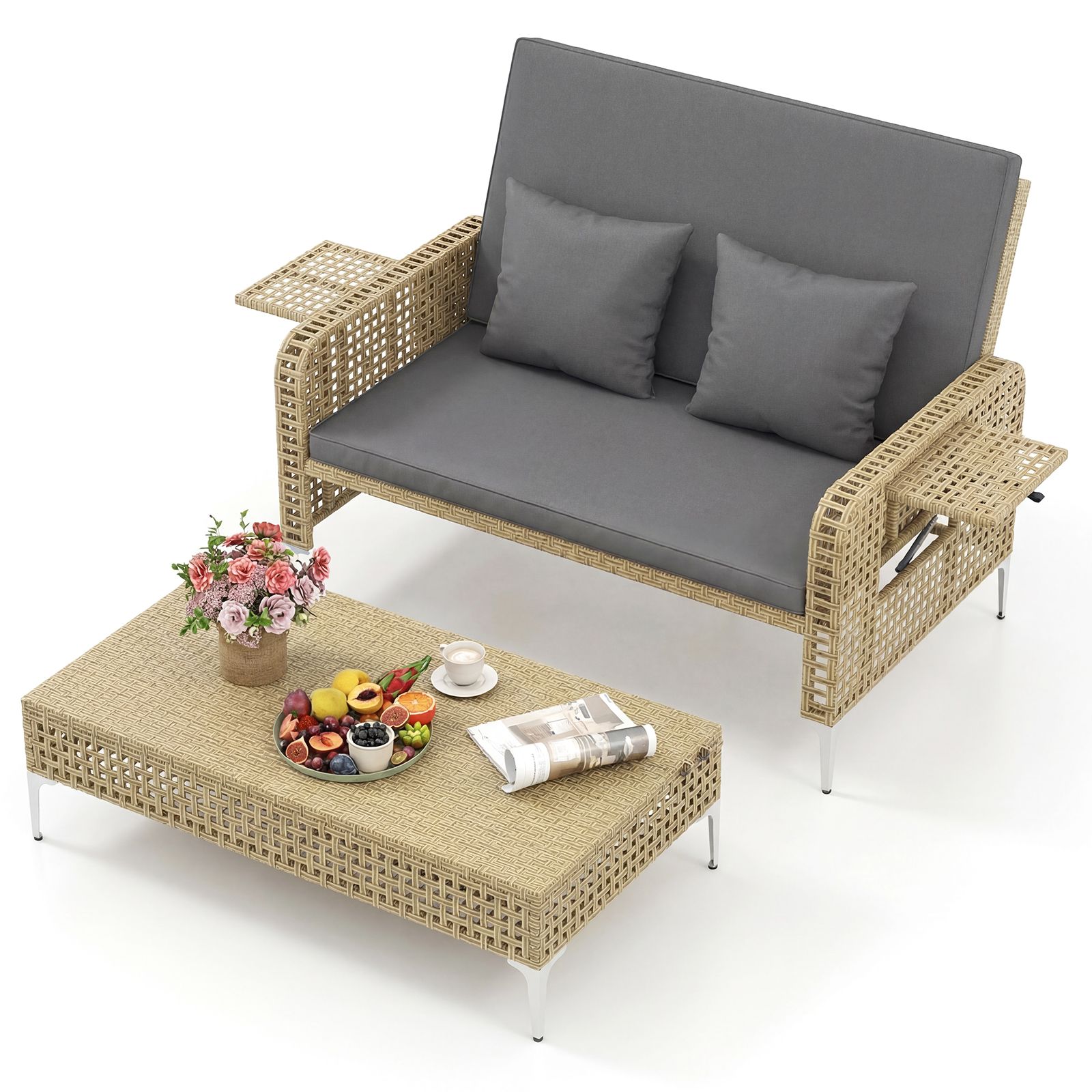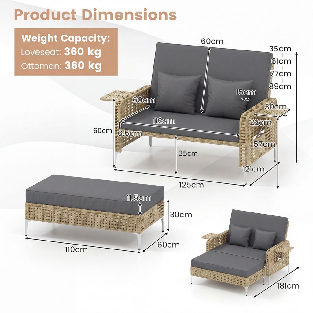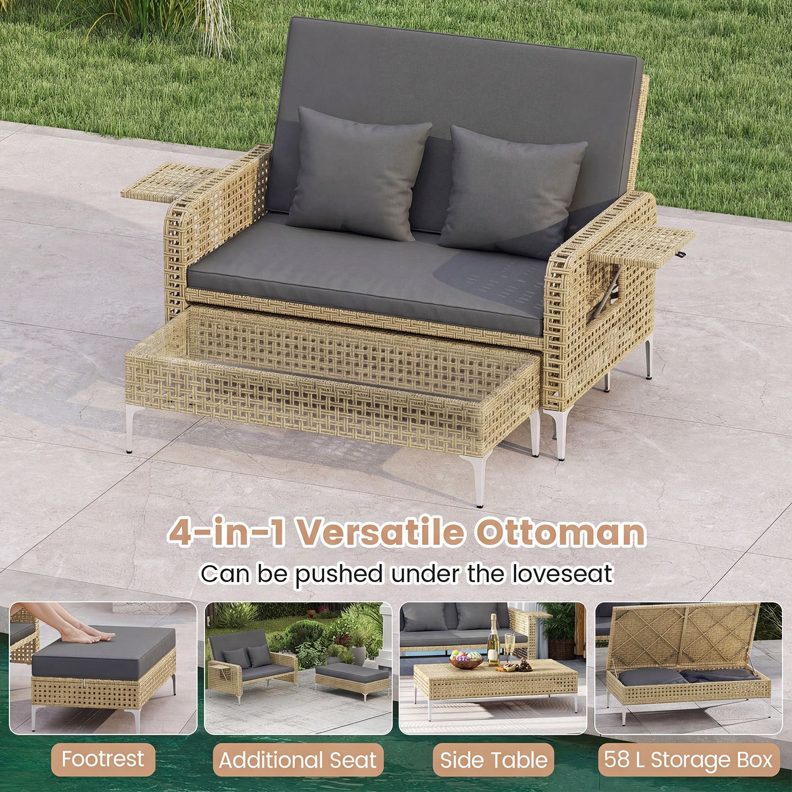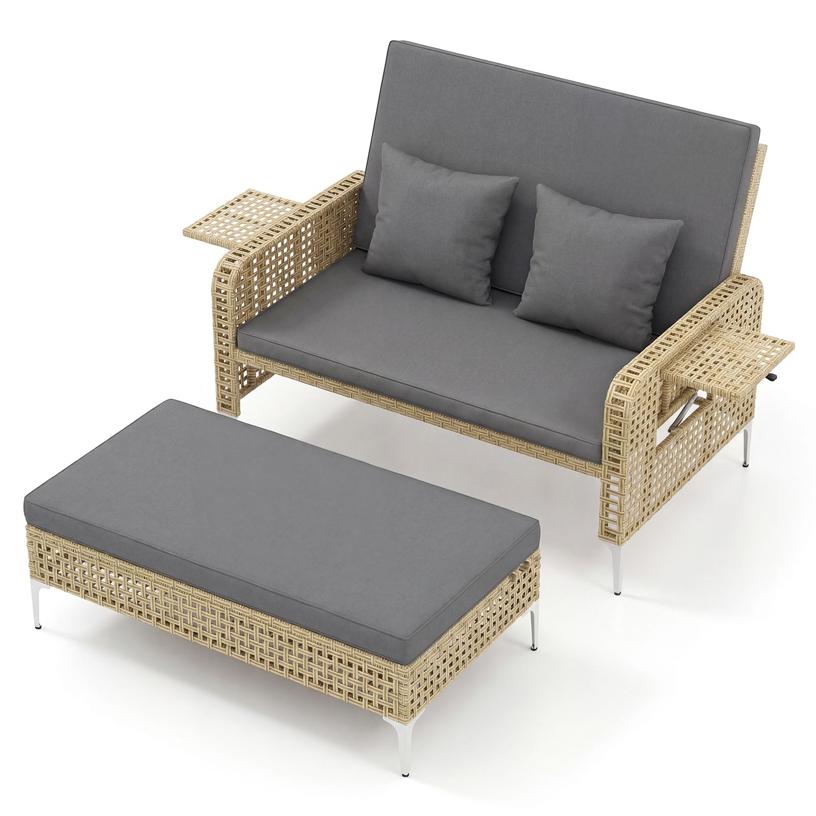 Flexible 2-Piece Furniture: The rattan sun lounger comprises a loveseat and storage ottoman that can be arranged together or separately to suit various settings. When not in use, the ottoman cushion can be tucked inside the ottoman itself, which slides underneath the loveseat to save valuable space.