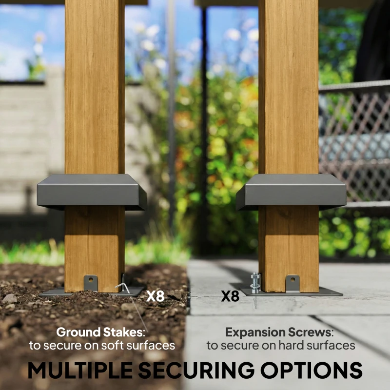 Enhanced stability: Crafted from 10 x 10 cm thick fir wood columns with triangle supports, the permanent gazebo offers natural beauty and reliable stability. Stakes and screws are included for added stability in level 7 winds on grass or concrete ground