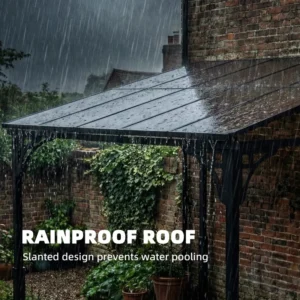 Sloped polycarbonate hardtop: This metal gazebo features a 7 mm thick PC roof that blocks UV rays while protecting from rain and snow. The sloped roof helps water and snow slide off easily; for safe use, accumulated snow should not exceed 10 cm in depth.