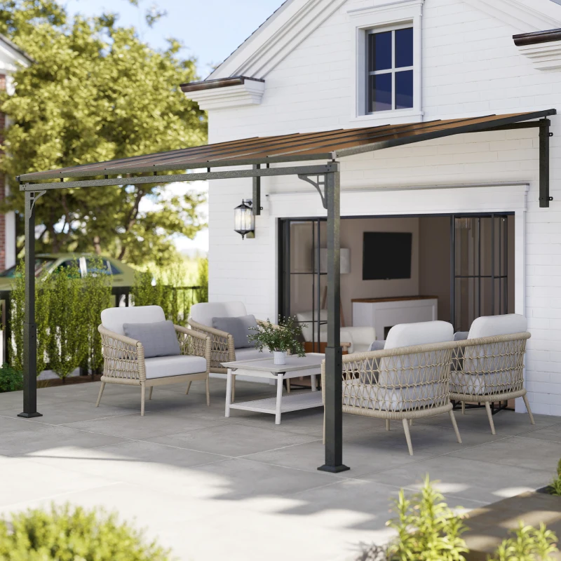 Securely anchored to your wall, it provides a stable shelter with a sloped polycarbonate roof that protects against sun, rain and snow. Its heavy-duty galvanised frame with reinforced columns ensures long-lasting strength, while the spacious design creates the desired spot for BBQs, dining, or relaxing with family and friends year-round.