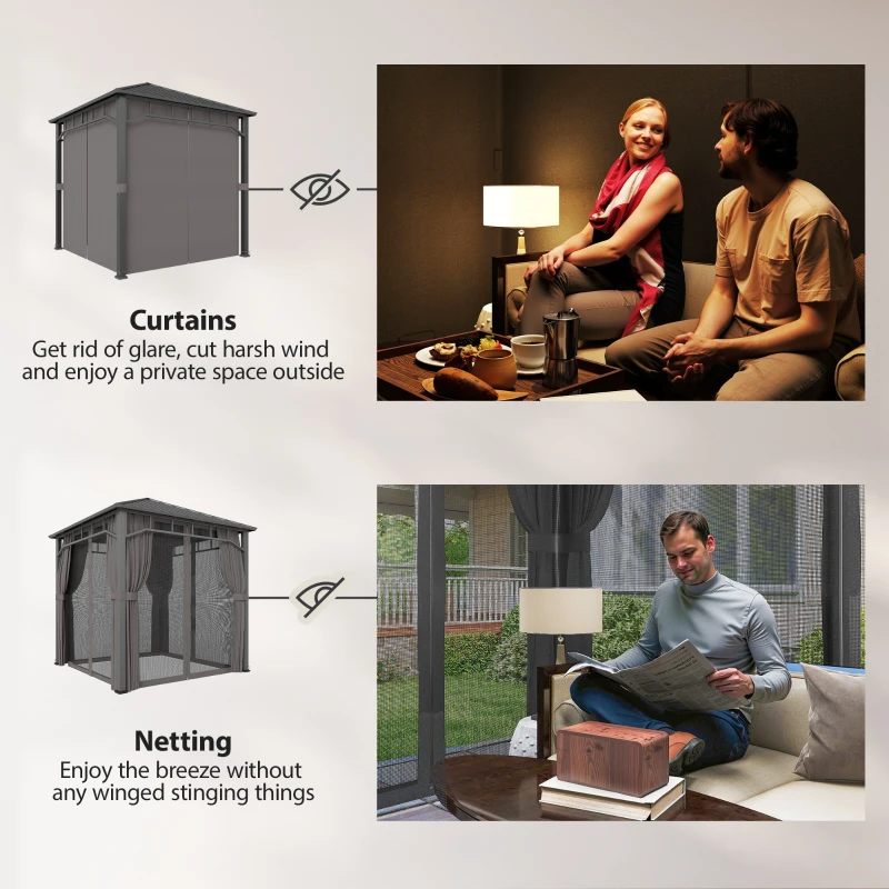 Enhanced privacy: Comes equipped with curtains and netting sidewalls, making this metal gazebo with sides great for private gatherings or enjoying tranquil outdoor moments.