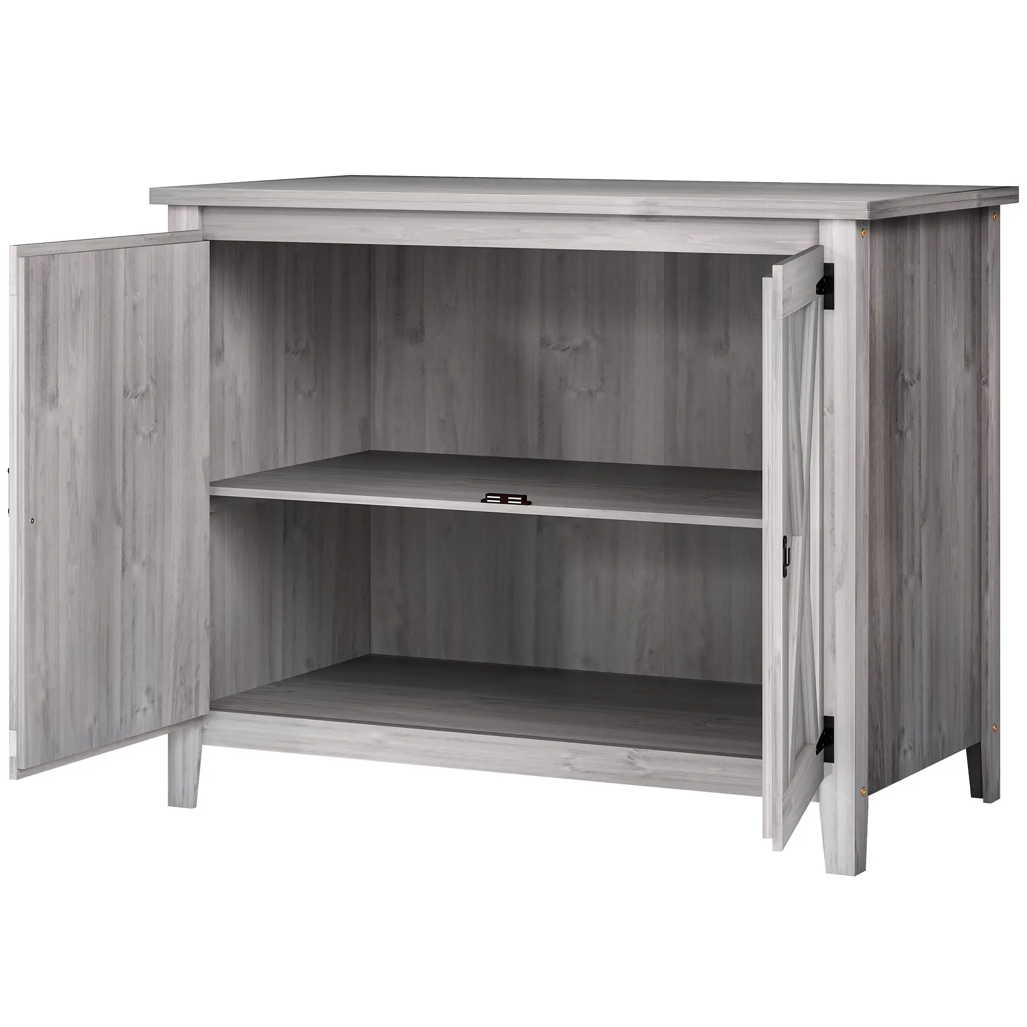 Secure and stylish: Keep your garden tools secure with a latch and enjoy the esthetic appeal of barn doors on this wood shed, adding charm to your outdoor area.