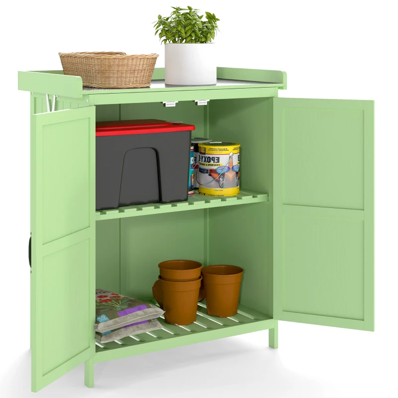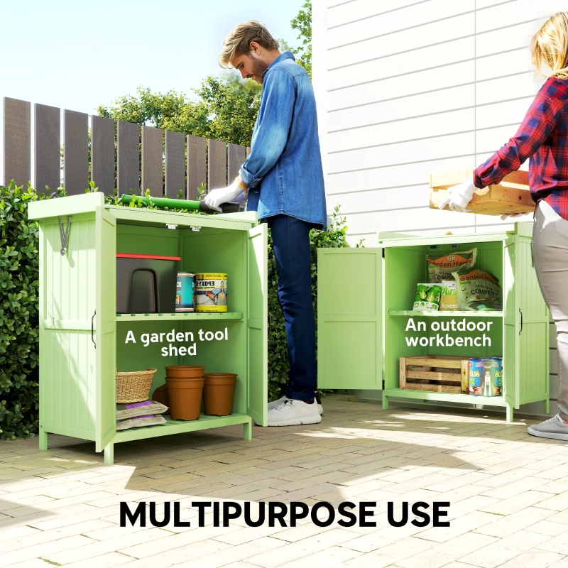 Doubling as a shed workbench, the Outsunny Timber Garden Tool Storage Cabinet with Hinged Roof and Shelf – Green is great for garages, greenhouses and other outdoor spots.