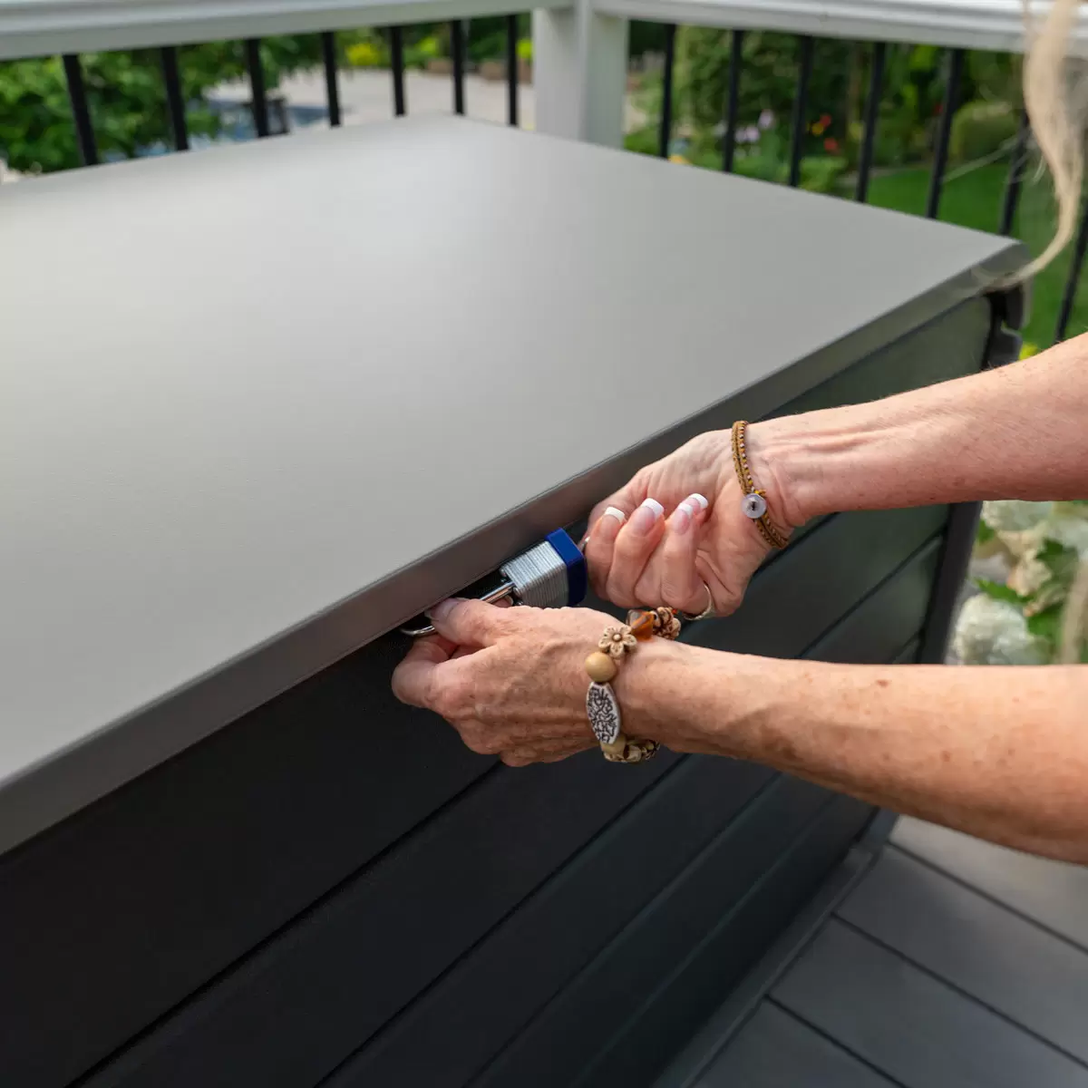 The lid is lockable (lock not included) to provide even greater security and has a controlled spring-hinge for easy opening and closing. Move it around your yard or patio easily with the molded side handles, or use it as a sturdy bench and sit in comfort. The Lifetime Deck Box blends durability, convenience, and style to create a versatile storage solution.