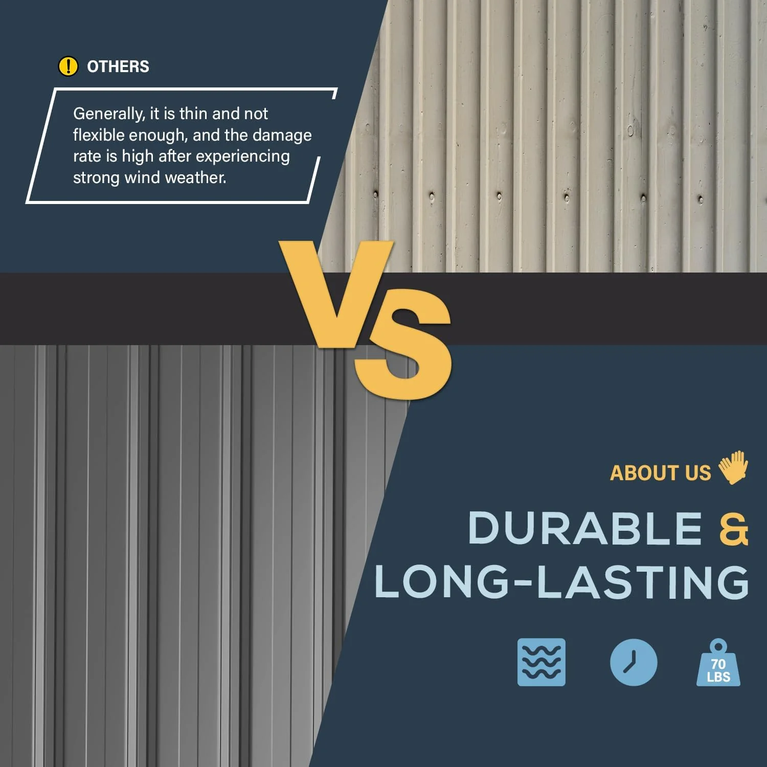 The shed is made of upgraded material, 0.27mm thicker galvanized steel panel and aluminum frame offers more secure than most of the other 0.25mm thick shed.