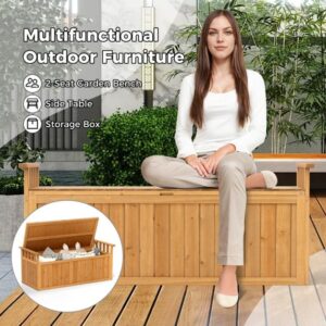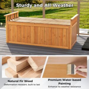 With a 209 Ltre storage capacity hidden beneath the seats, you can store cushions, gardening tools, or outdoor toys with ease, keeping your space neat and clutter-free. And the lid adopts flexible hinges, providing easy access. Additionally, it is crafted of natural fir wood with water-based painting, ensuring long-lasting use in various weather conditions. It is essential to note that the wooden structure may allow rainwater to seep in during heavy downpours. Please place it in a covered area during heavy rains.