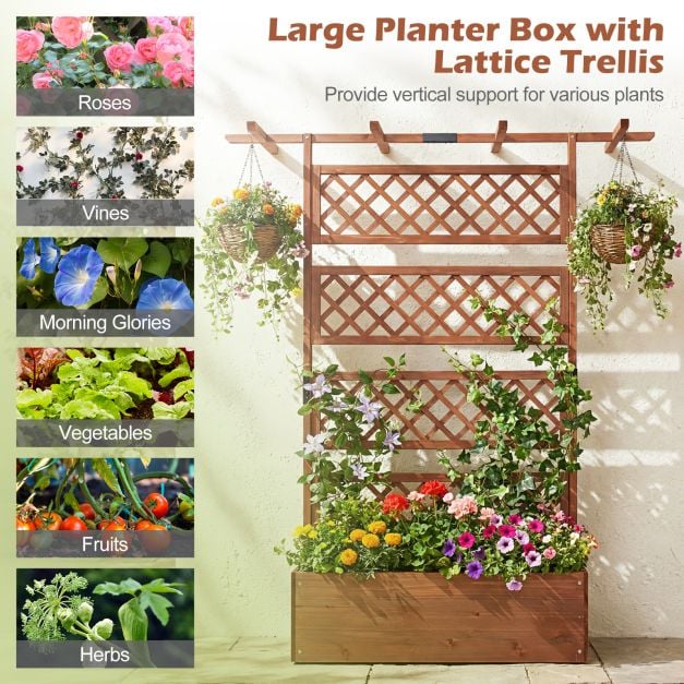 Optimal Vertical Support: This raised garden bed features a large planter box with lattice trellis, providing vertical support for various plants. And there is a flat roof with crossbars, providing sturdy support for hanging baskets and decorations, creating a flourishing garden display.