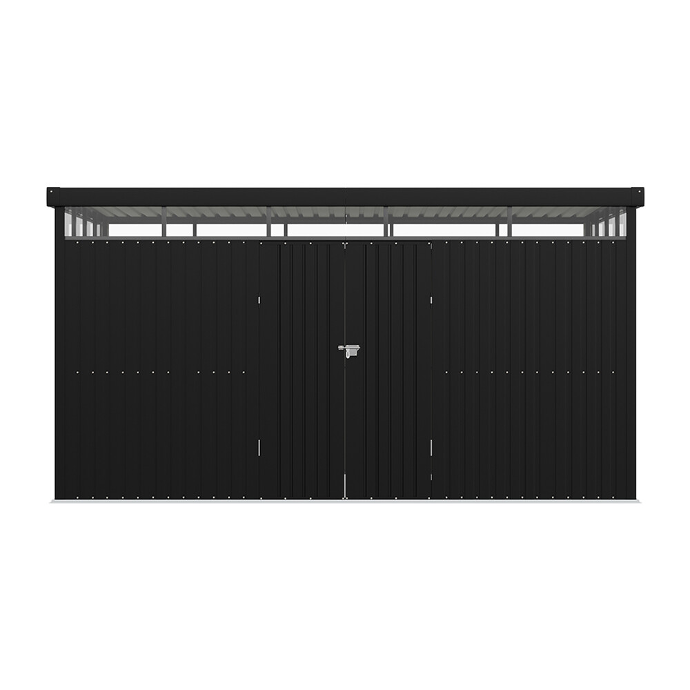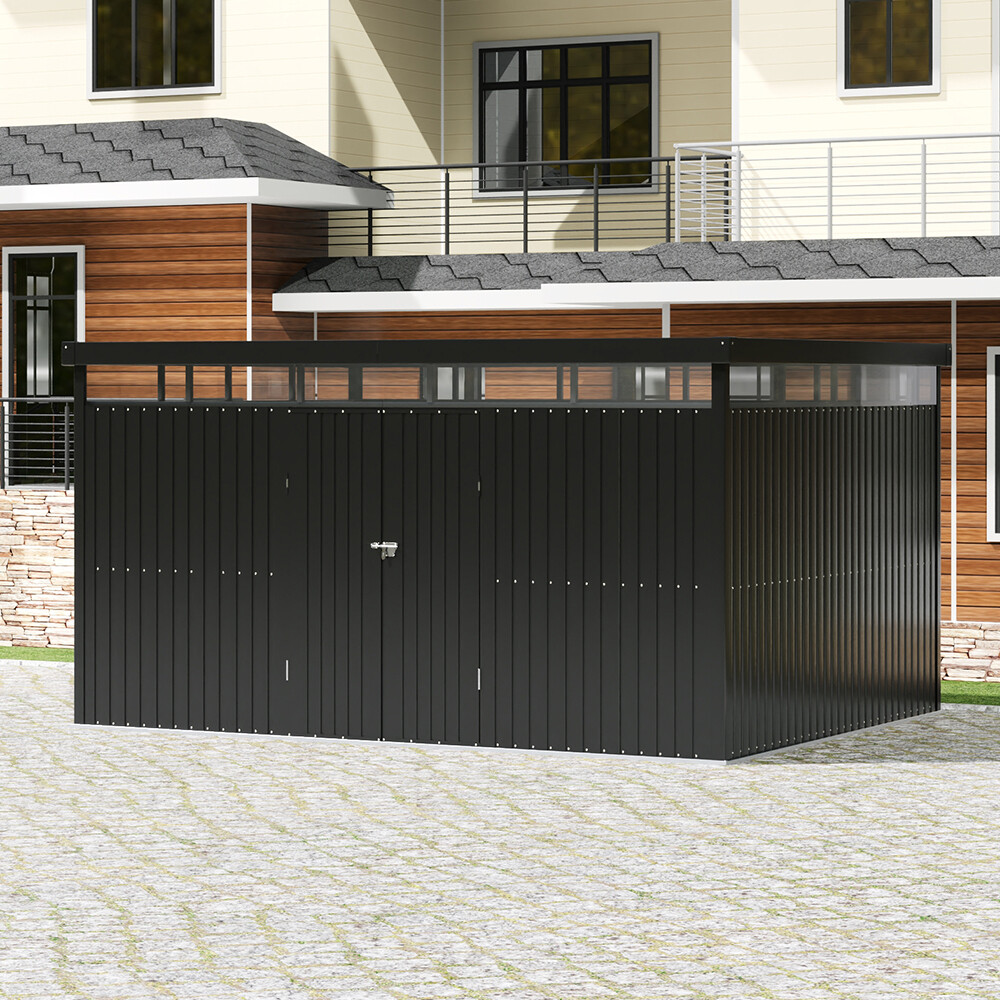 The double-door design offers easy access to your equipment. Perfect for storing lawnmowers, gardening tools, and outdoor equipment, this shed keeps everything safe and secure.