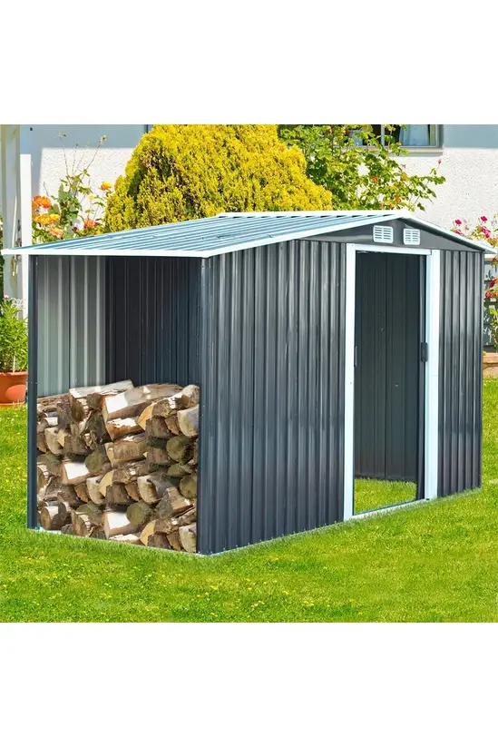 This versatile storage shed combines an enclosed tool compartment with an open firewood bay for efficient organisation.