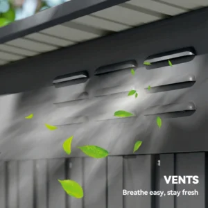 Secure access with healthy airflow: A smooth sliding door allows easy entry, while front roof vents improve air circulation inside the metal garden shed to reduce damp and protect stored belongings