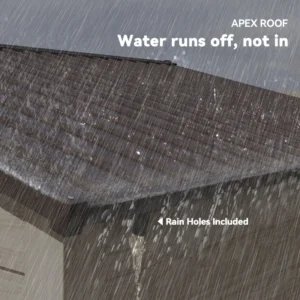 Sloping roof: Allows water to roll down to the ground, preventing buildup, stagnation and rust damage to this outdoor shed.
