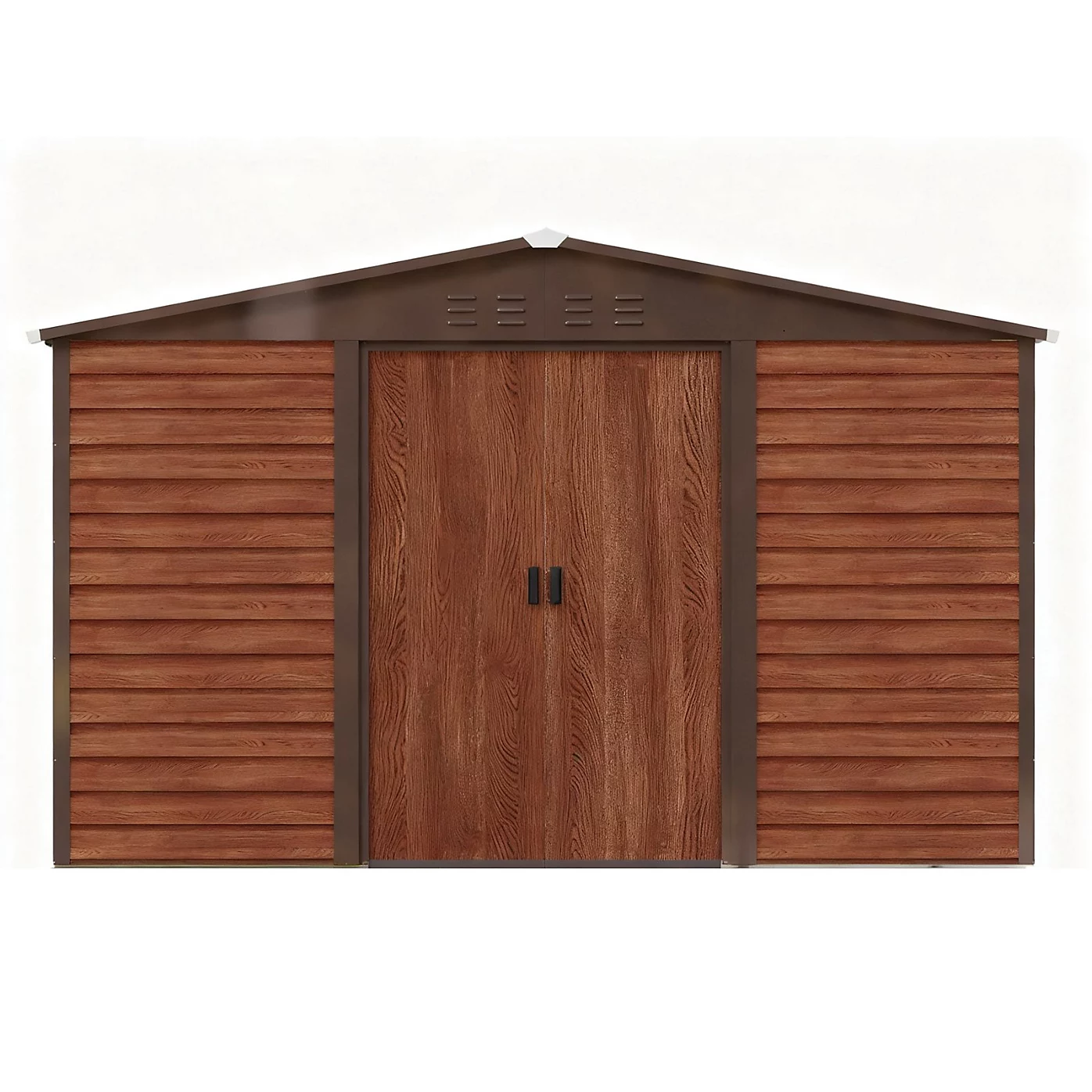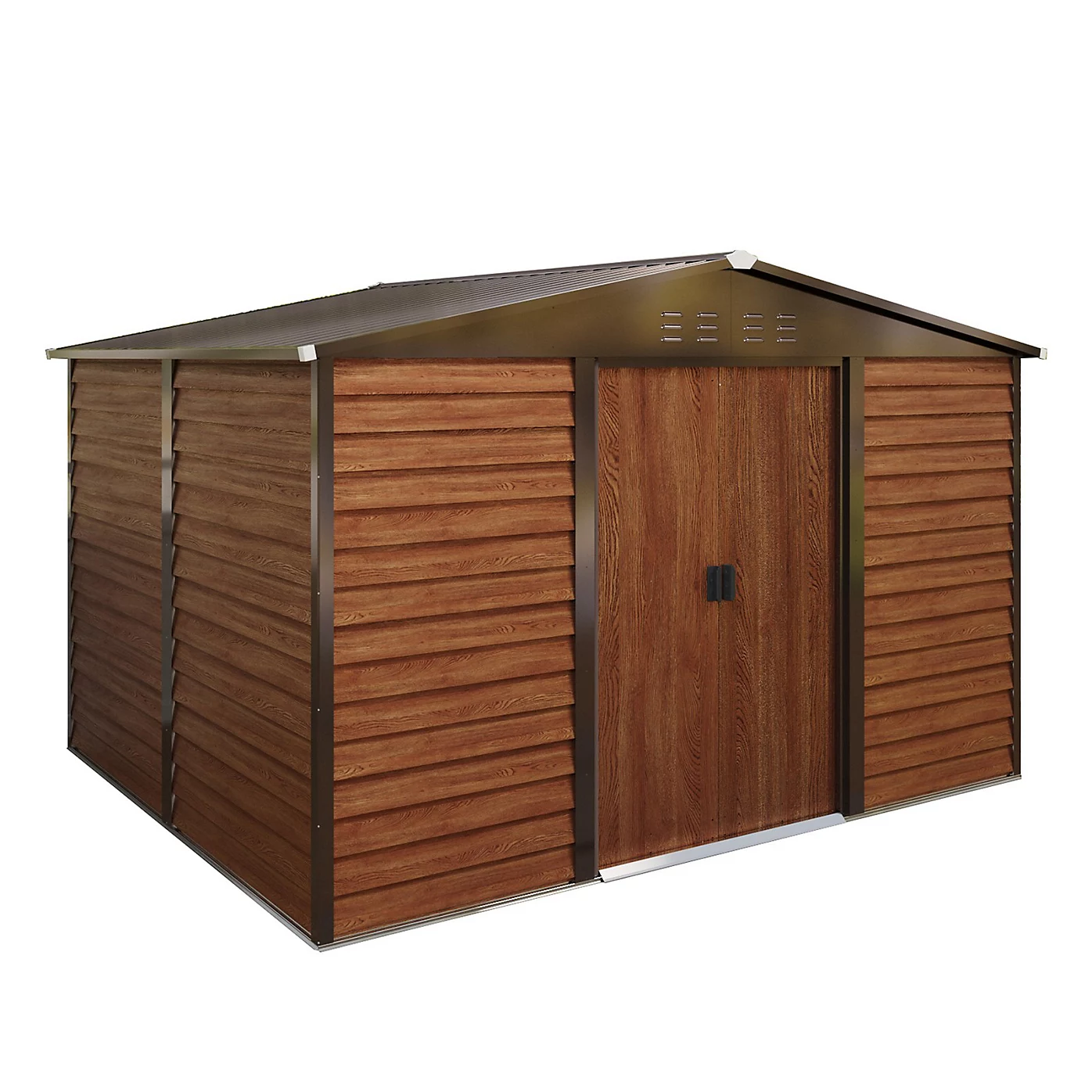 The Pro-Tect 10’x8′ Woodlook Metal Apex Shed with Foundation Grid – Brown features a minimalist design with premium-grade materials, perfectly combining aesthetic appeal with outstanding durability.