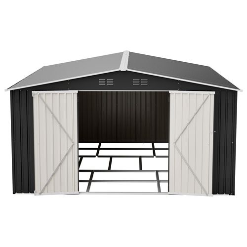 This Pro-Tect 12’x14′ Metal Apex Shed with Foundation Grid – Anthracite offers ample room for tools, bikes, lawn equipment, and more, making it an ideal outdoor shed for organized backyard storage.
