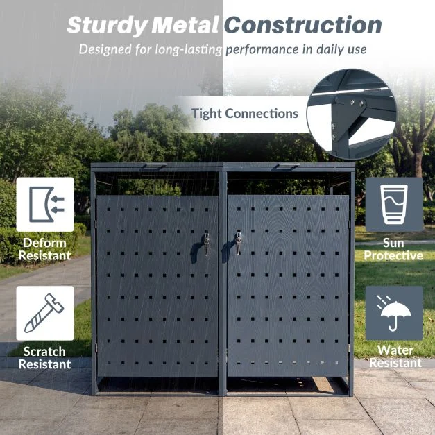 Its spacious divided layout accommodates 2 large bins, making waste sorting and management easy for daily use. Constructed from scratch-resistant, deform-resistant, sun-protective, and water-resistant metal panels, the unit offers long-lasting shelter against sun and rain, while the lockable dual front doors keep your trash secure.