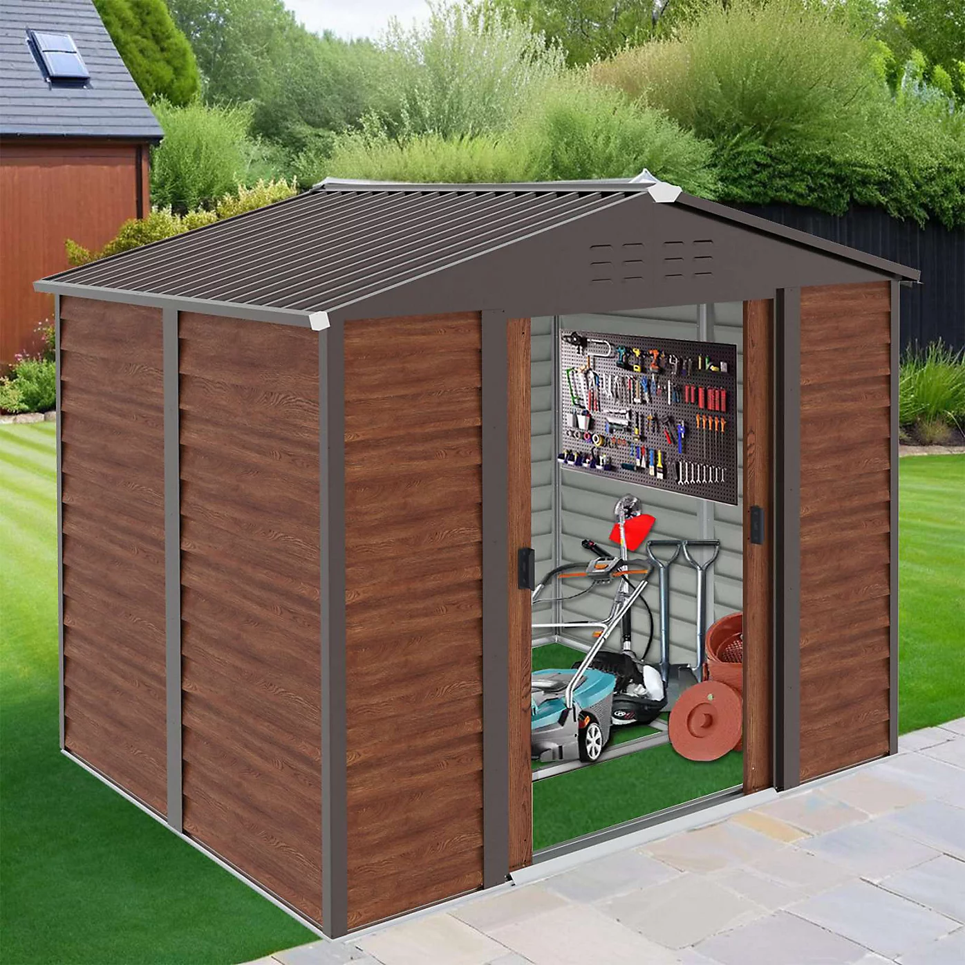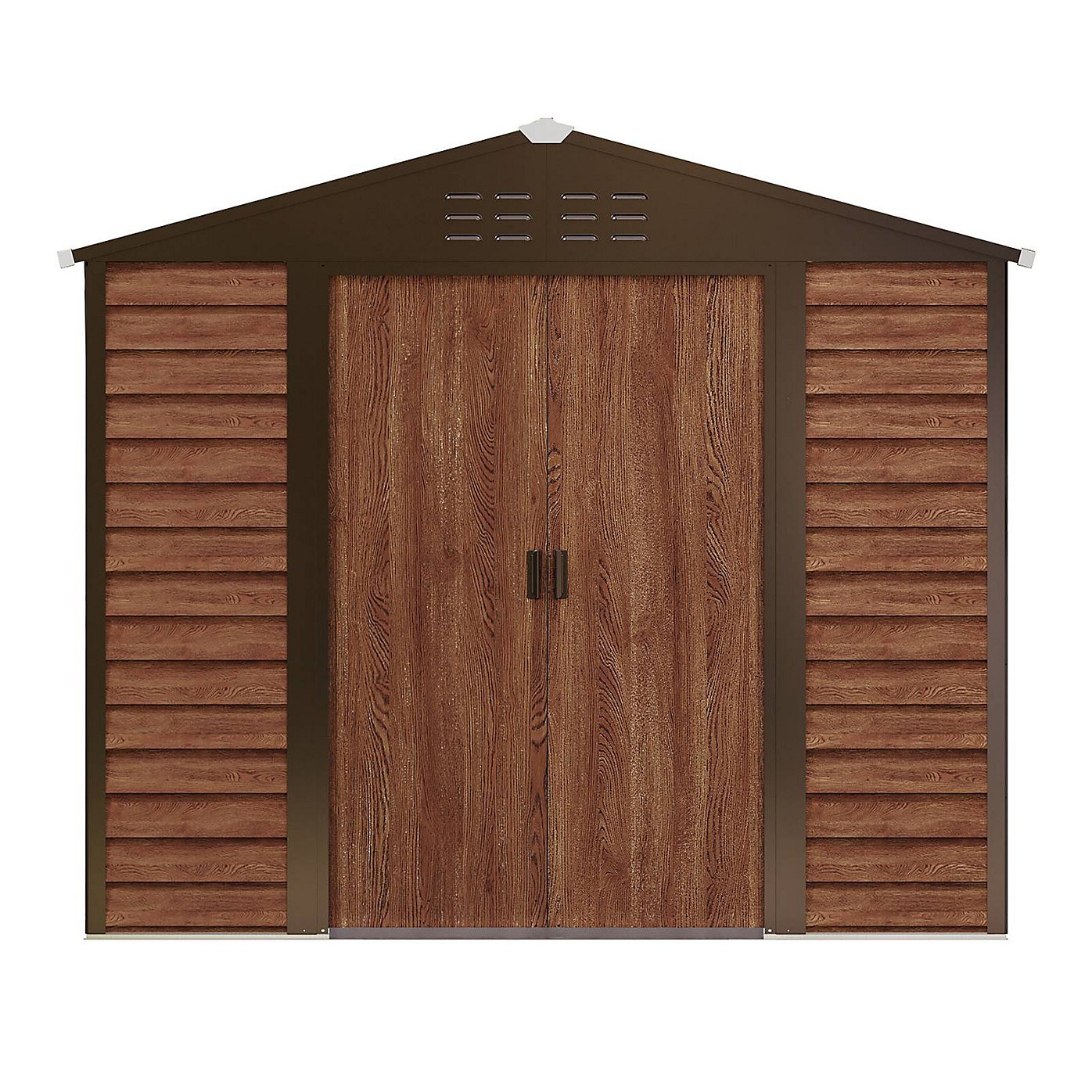 The Pro-Tect 8’x6′ Woodlook Metal Apex Shed with Foundation Grid – Brown features a minimalist design with premium-grade materials, perfectly combining aesthetic appeal with outstanding durability.