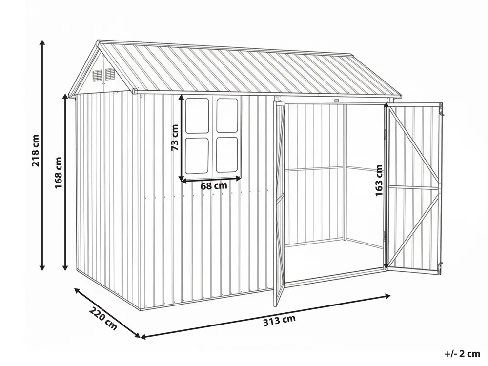 The Pro-Tect Nocciano 10’x7′ Double Hinged Metal Shed – Warm Brown Grey is a functional storage solution for any outdoor space.