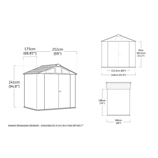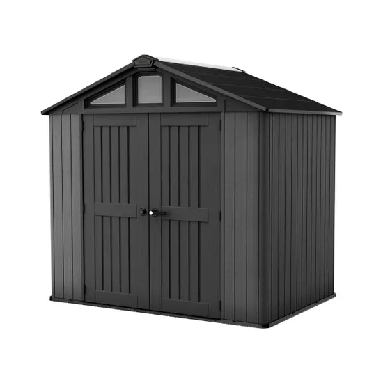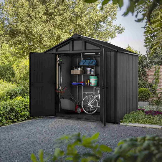 The Keter 8’x6′ Stronghold Heavy Duty Plastic Shed – Grey delivers the perfect balance of elegant design, robust construction, and generous storage space, ideal for keeping your garden and outdoor equipment organised, secure, and protected.
