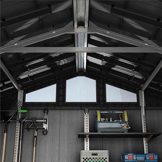 Constructed from Evotech+ resin composite panels, the shed offers the timeless appearance of traditional materials without the upkeep – no rotting, peeling, denting, or fading. The 19mm double‑wall engineering ensures exceptional strength and durability, making it a reliable choice for year‑round use.