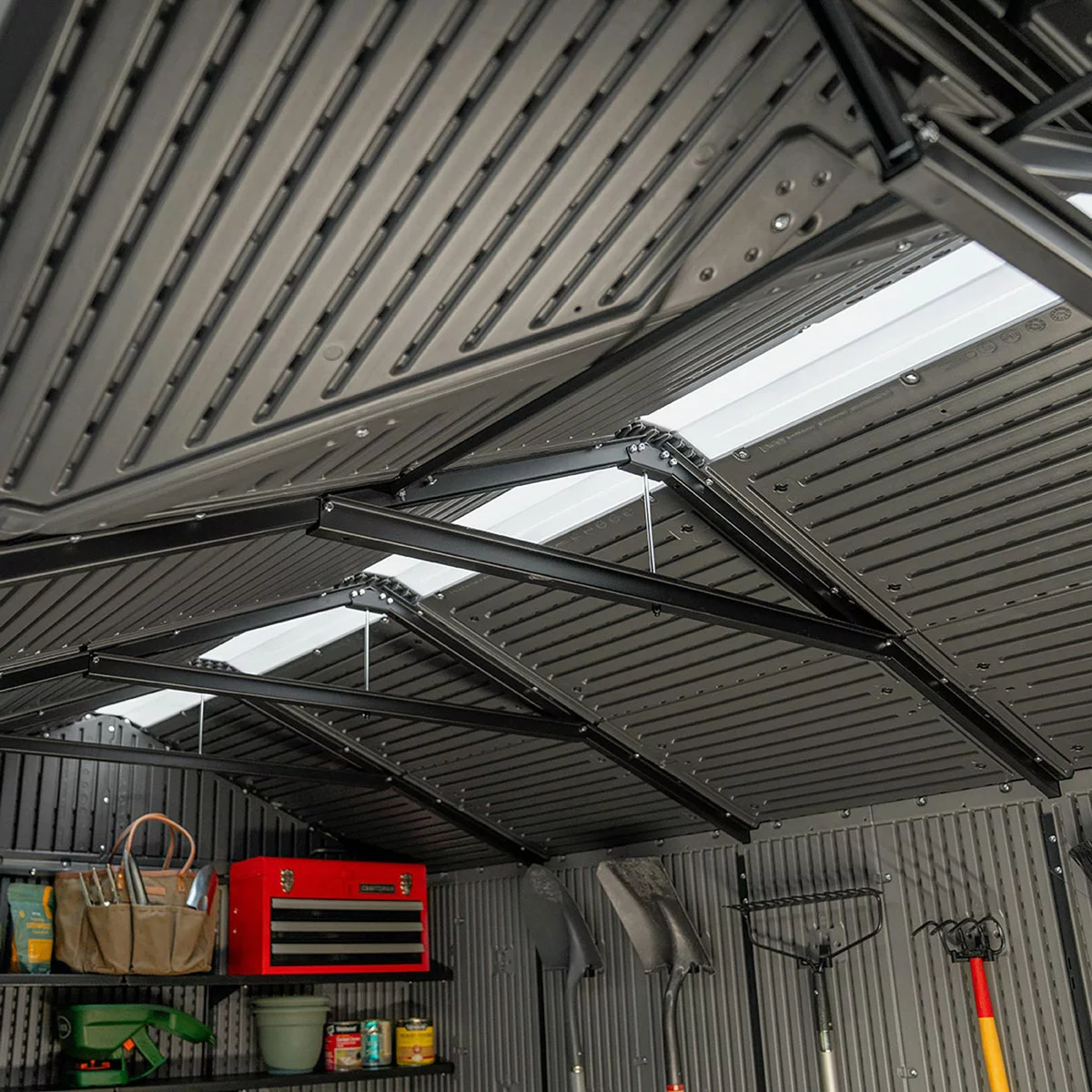 Eight skylights provide rich natural interior lighting and the high-pitched roof allows for quick drainage of rain and snow. A unique side-entry design gives you a great look and easy access to your space. The shed is made of steel-reinforced high-density polyethylene and a sturdy double wall system for maximum durability and longevity, and heavy-duty steel trusses provide exceptional roof strength.