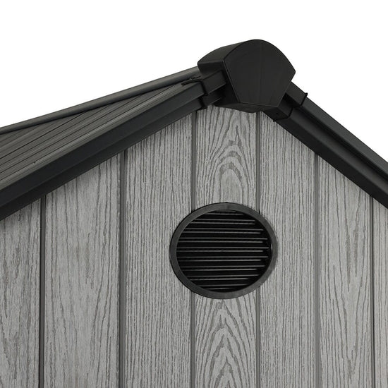 Aesthetic Design: The attractive grey woodgrain texture and contrasting black roof complement any garden style.