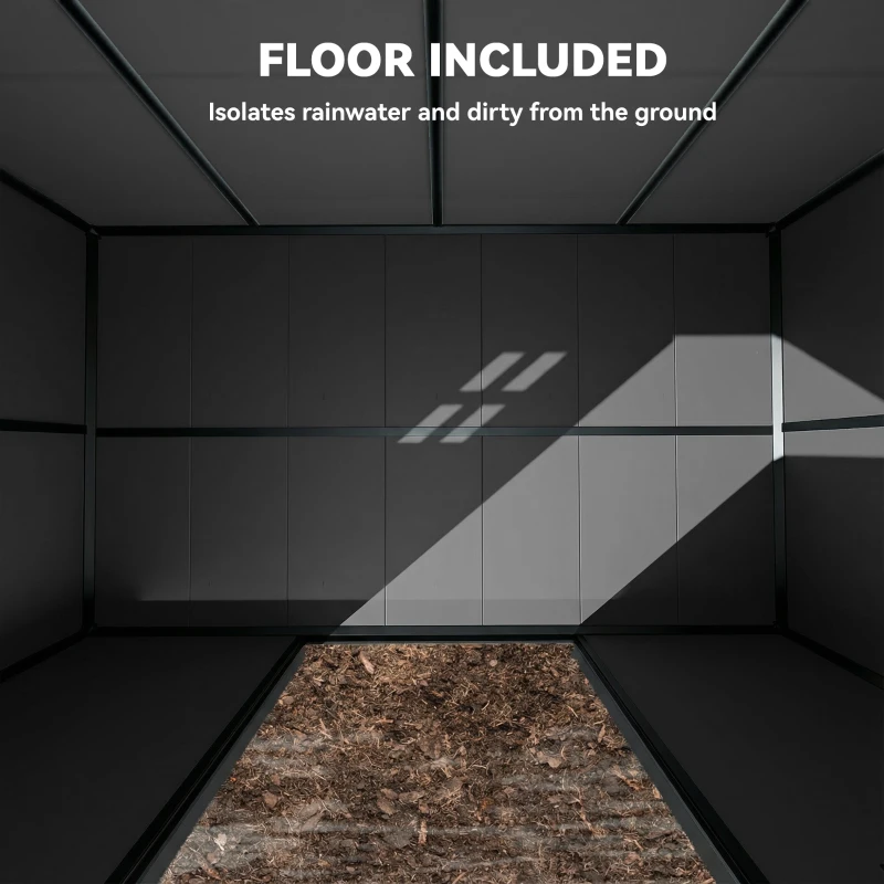 All-weather, low-maintenance build: Made from thick 12 mm PP panels with a strong aluminium frame, this plastic garden shed is UV-resistant and water-repellent, with no painting, rust or rot to worry about. A built-in floor to block ground moisture