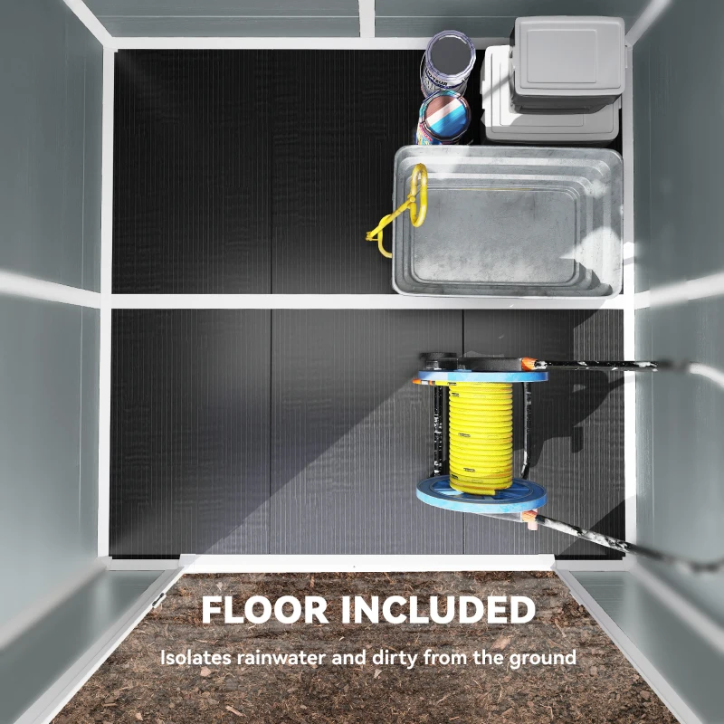 All-weather, low-maintenance build: Made from thick 12 mm PP panels with a strong aluminium frame, this plastic garden shed is UV-resistant and water-repellent, with no painting, rust or rot to worry about. A built-in floor to block ground moisture