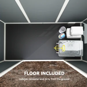 All-weather, low-maintenance build: Made from thick 12 mm PP panels with a strong aluminium frame, this plastic garden shed is UV-resistant and water-repellent, with no painting, rust or rot to worry about. A built-in floor to block ground moisture