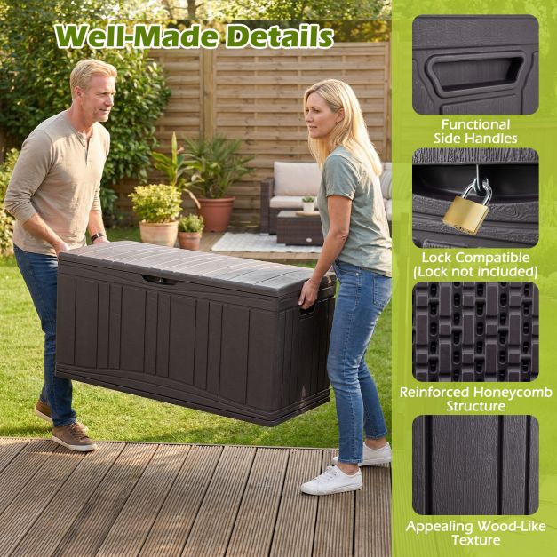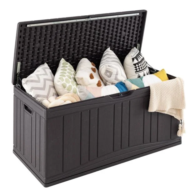 Stylish Patio Addition: The outdoor plastic storage bin is designed with appealing wood-like texture for more elegance. Moreover, the functional side handles make it easy to move and ideal for patios, poolsides, and gardens.