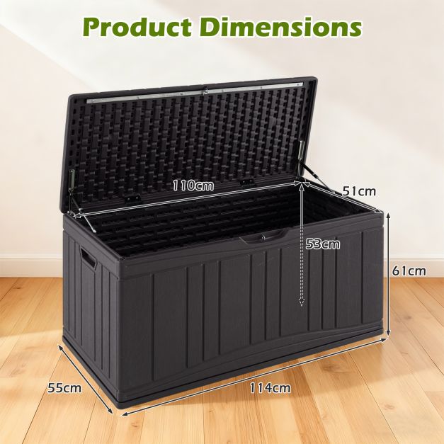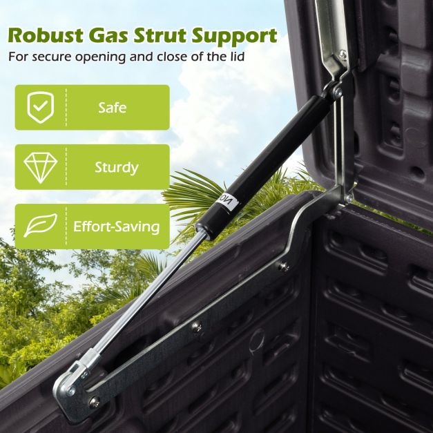 Crafted from waterproof, sunproof HDPE, it resists harsh weather while remaining easy to clean. Inside, a reinforced honeycomb structure ensures strength, and 2 sturdy gas struts are designed for secure opening and close of the lid. The lock-compatible lid secures your valuables, while its 150 kg capacity allows for extra seating. Featuring multiple well-made details, this deck box combines practicality with style for different outdoor space.