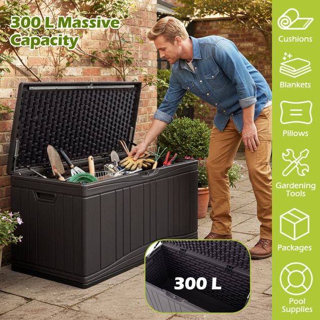 Roomy Space for Everything: With 300 L massive capacity, this large patio deck box provides ample storage for cushions, blankets, pillows, gardening tools, packages, and pool supplies, keeping your outdoor essentials organized and protected.