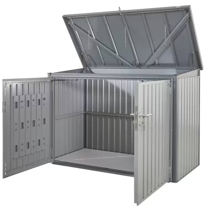 The large Horizontal storage shed with outward opening double doors and hinged lid with gas struts for easy opening. Suitable for storing bikes, wheelie bins (2 x 360 litre or 3 x 240 litre) or an array of other household items, concealing clutter and securing valuables completely away from view.