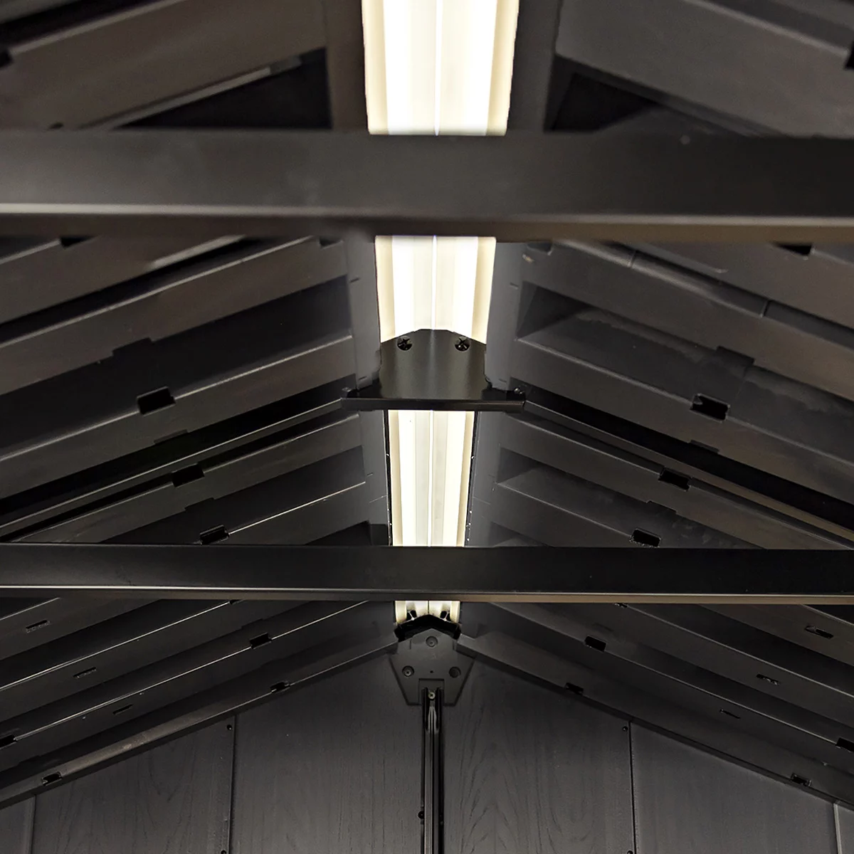 The shed feature innovative Evotech panels that mimic the appearance and texture of real wood, while providing the advantages of resin. No maintenance is required as they will never rust, rot, or peel. The Rosewood shed in size 7,5×17 is the ideal storage solution when you have a multitude of items to organize. Its wide configuration ensures easy visibility, accessibility and convenience, while features like a raised floor, vents for airflow and a lockable design prioritize the safety and security of your belongings.
