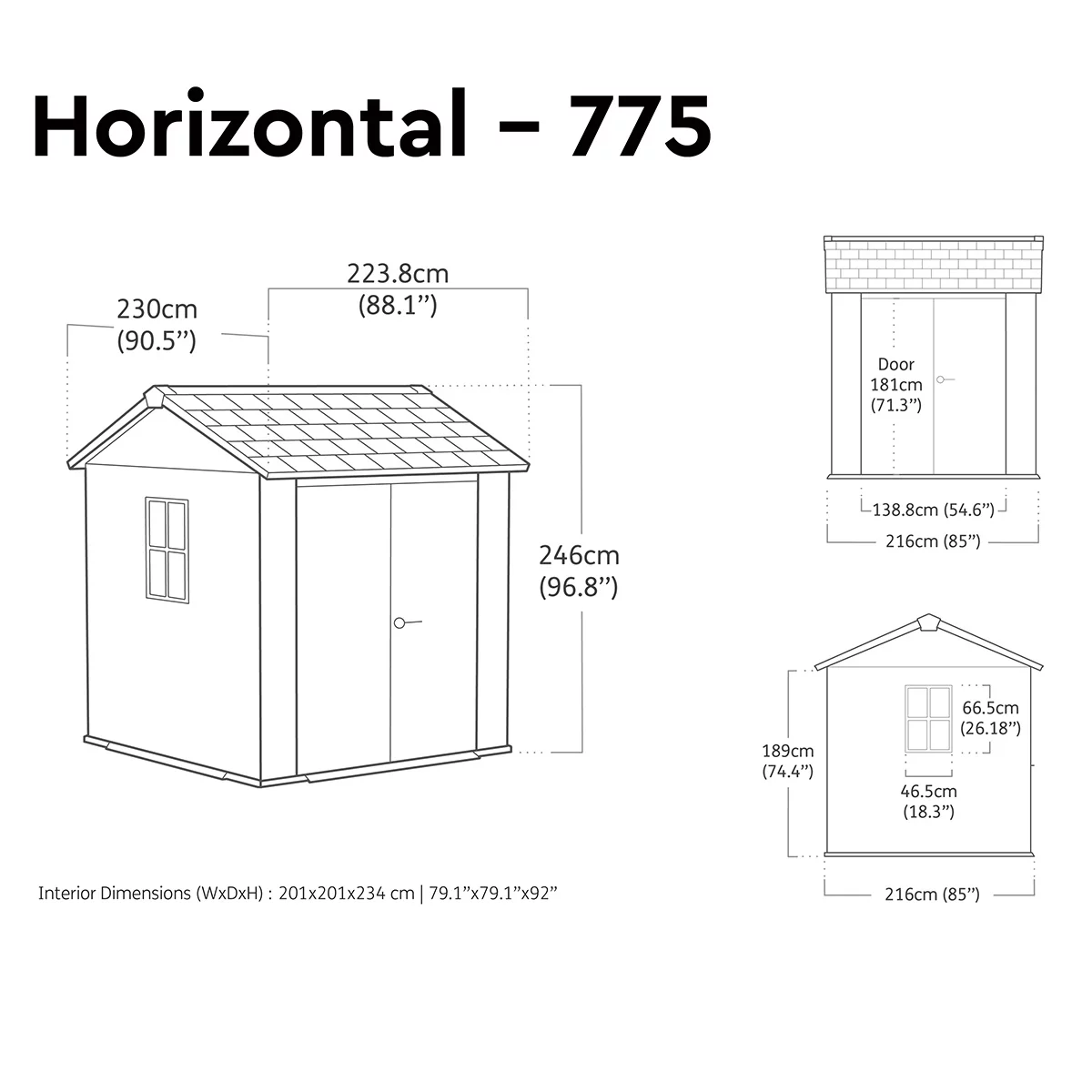 External Dimensions: H 246 x W 230 x D 223.8 cm (*including the overhang of the eaves)