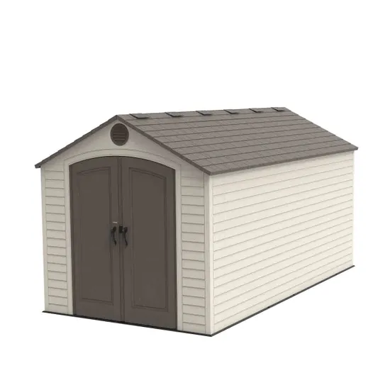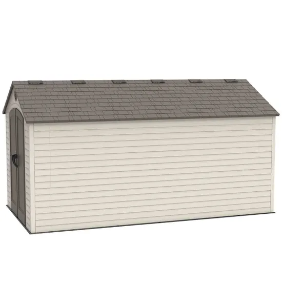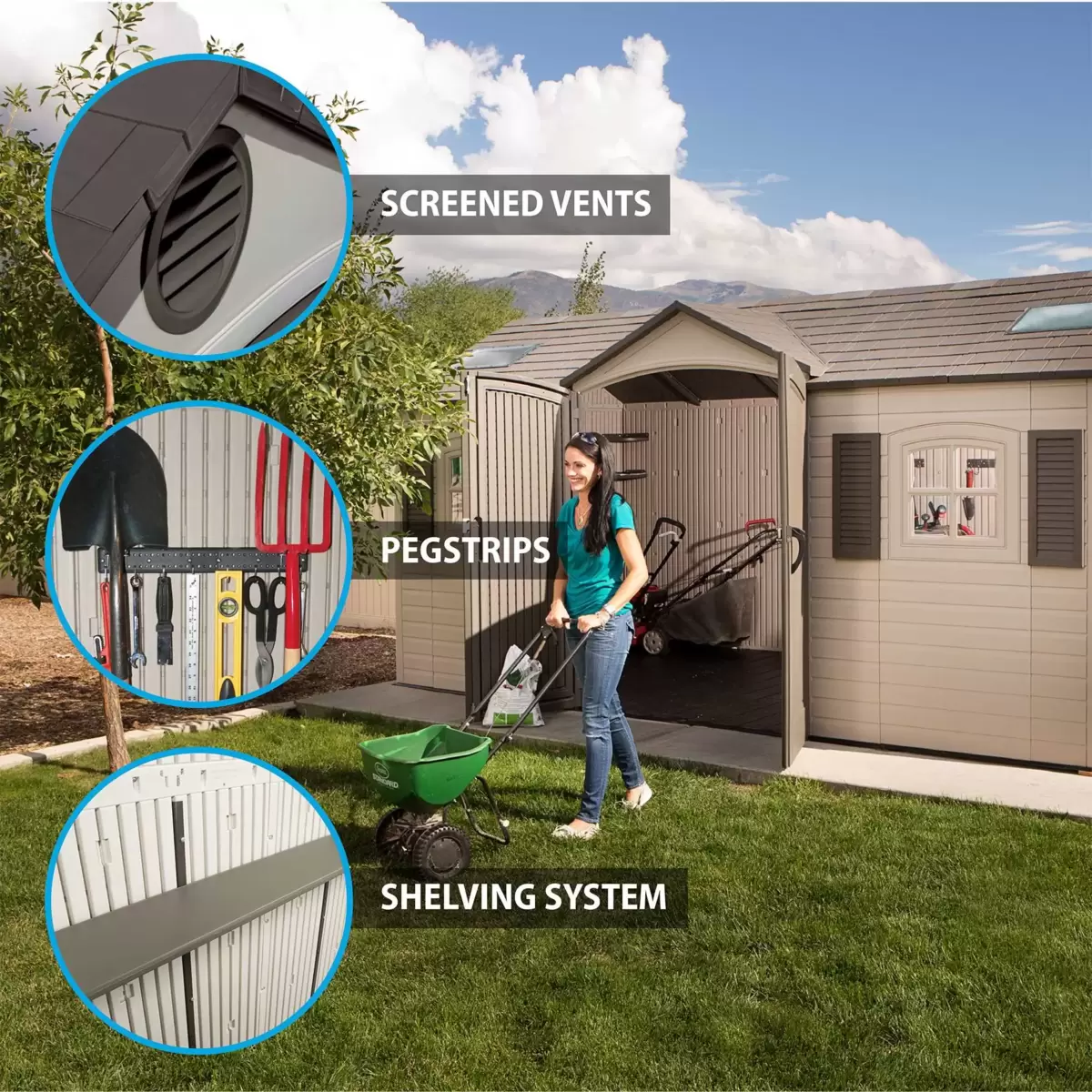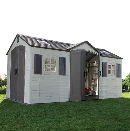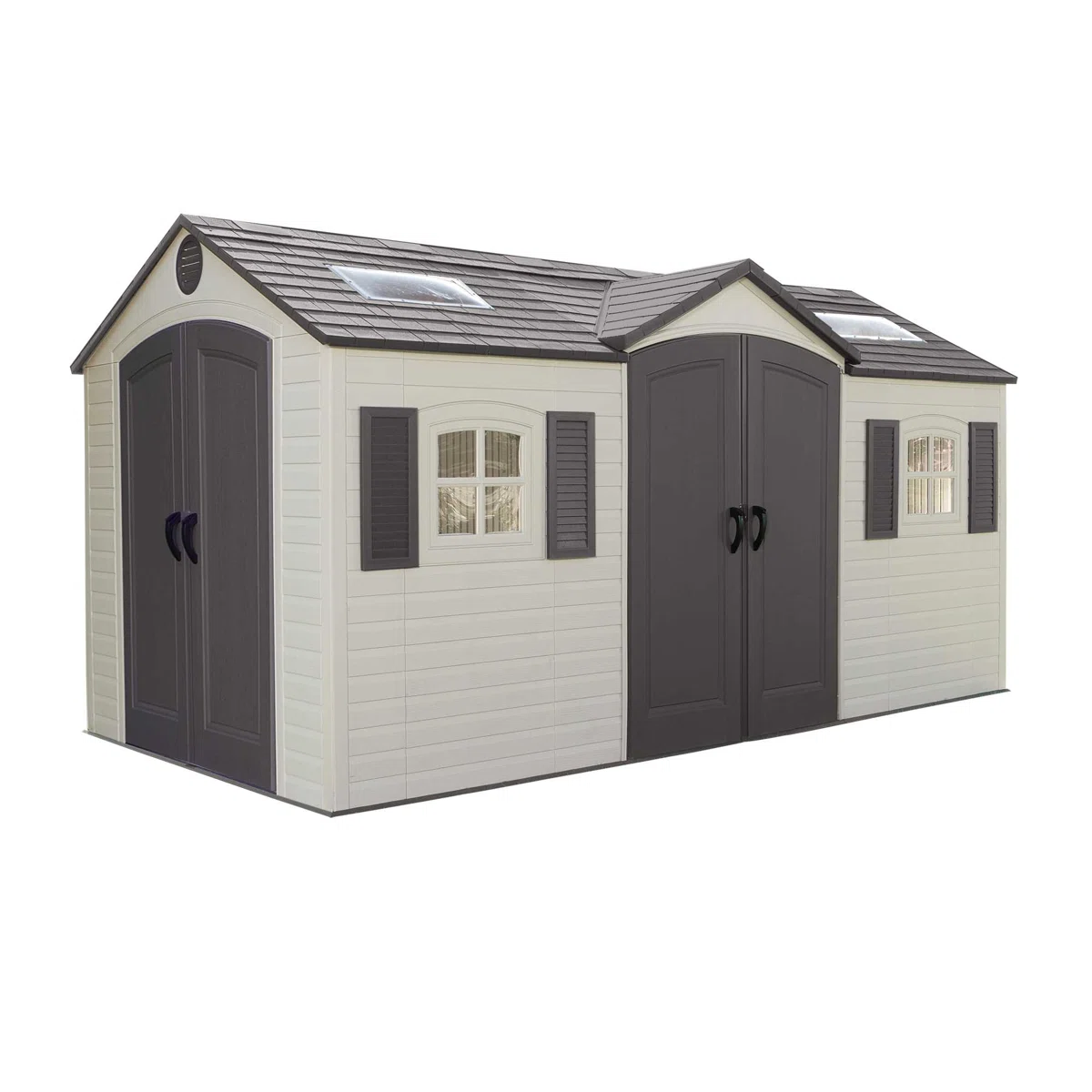 The Lifetime 15×8 Heavy Duty Plastic Shed – Dual Entry X60079 is a high quality, very large apex garden shed featuring a wide double door on centre of the 15ft side, and another double door on the 8ft end.