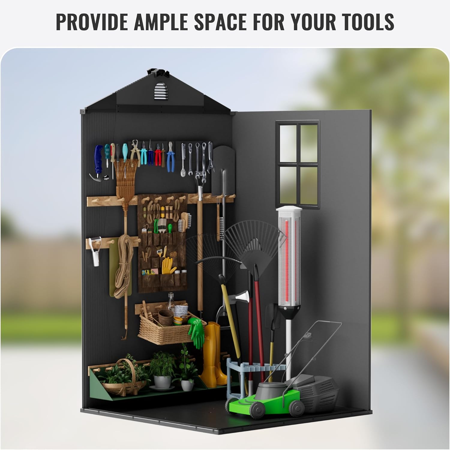 This generously sized shed is the perfect solution for a clutter-free garden, patio, or backyard, effortlessly storing everything from gardening tools and lawnmowers to bicycles, ladders, and shelving units.