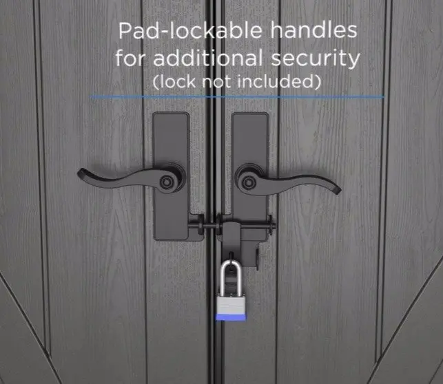 The large double-door entryway provides easy access to your belongings and is equipped with pad-lockable metal handles to keep them safe and secure (lock not included).