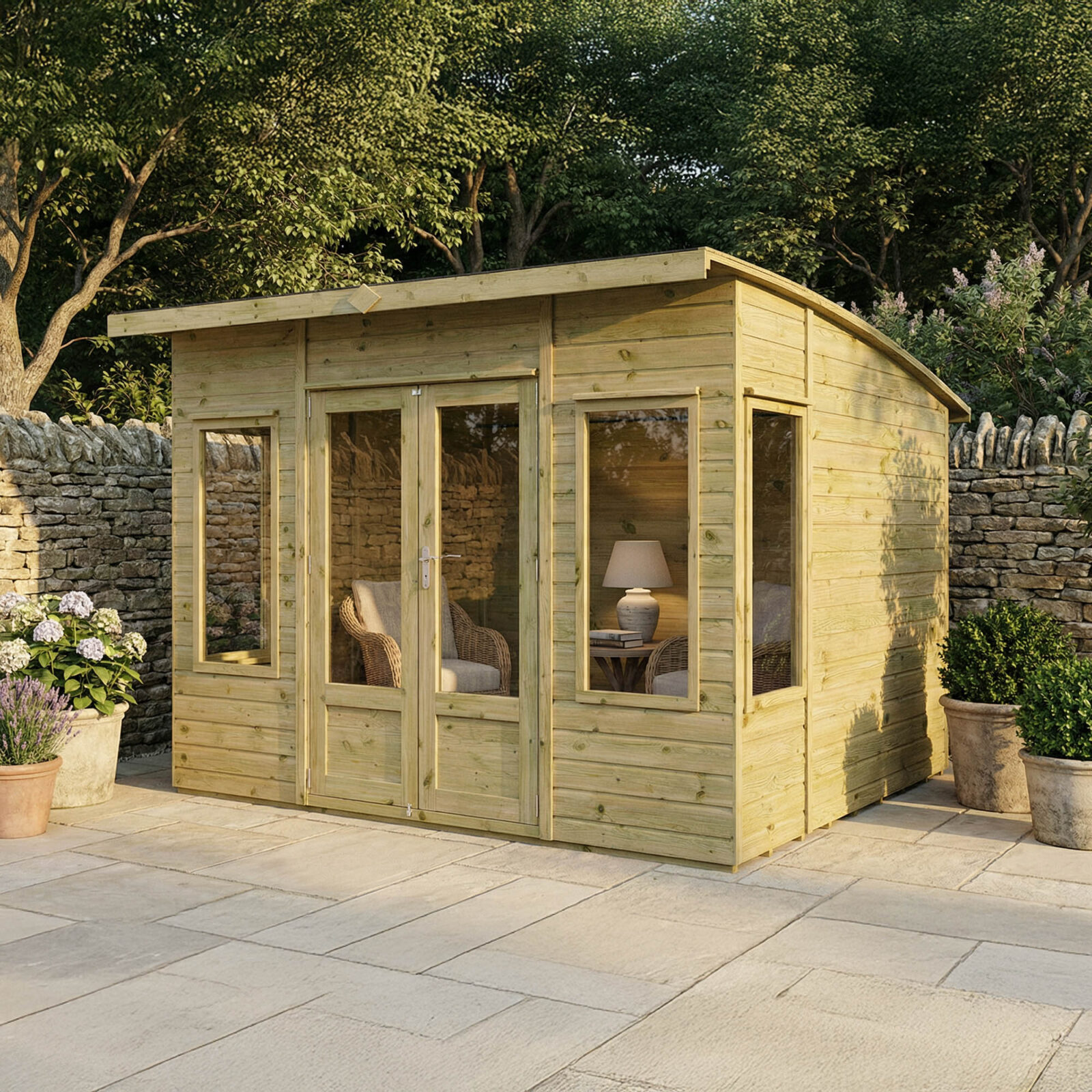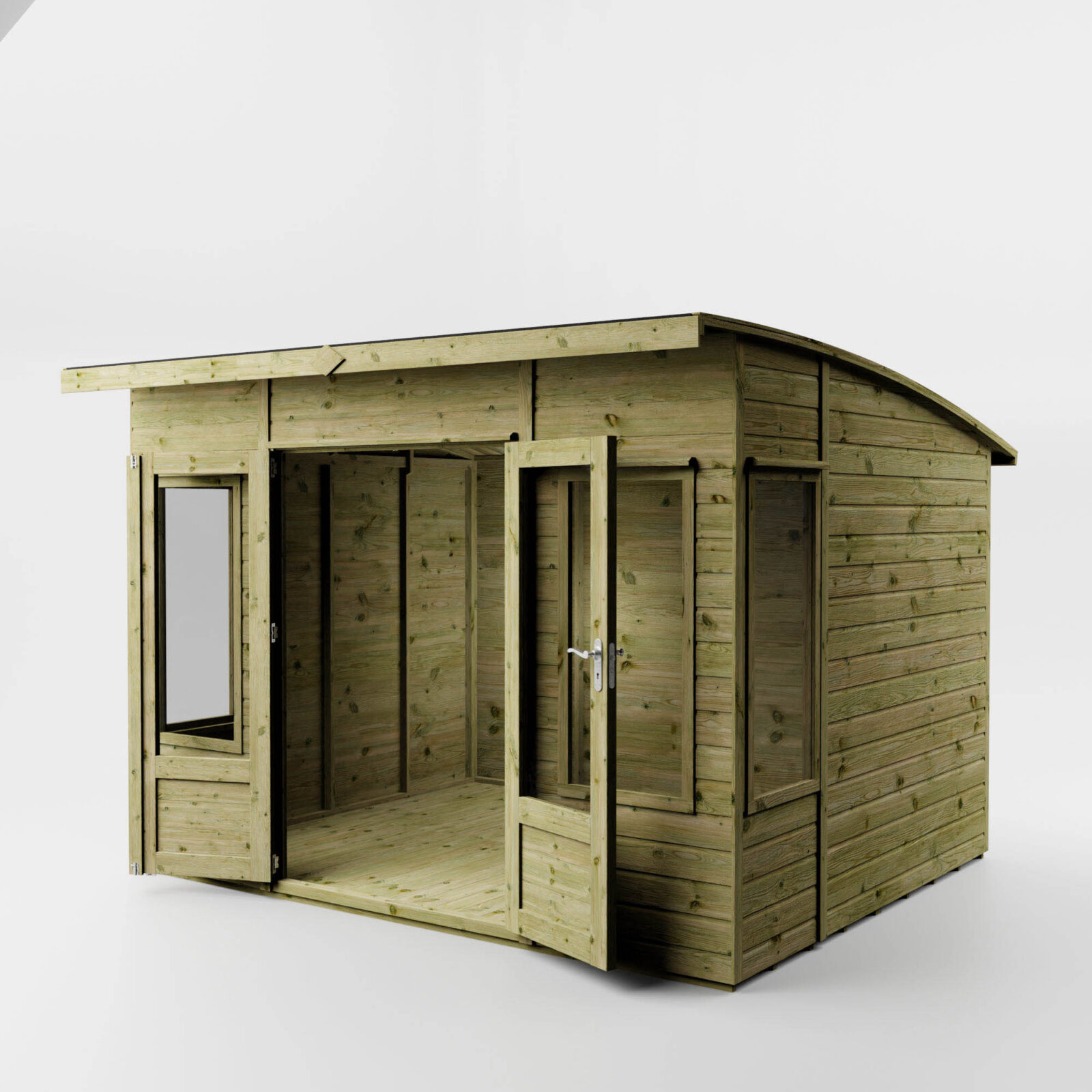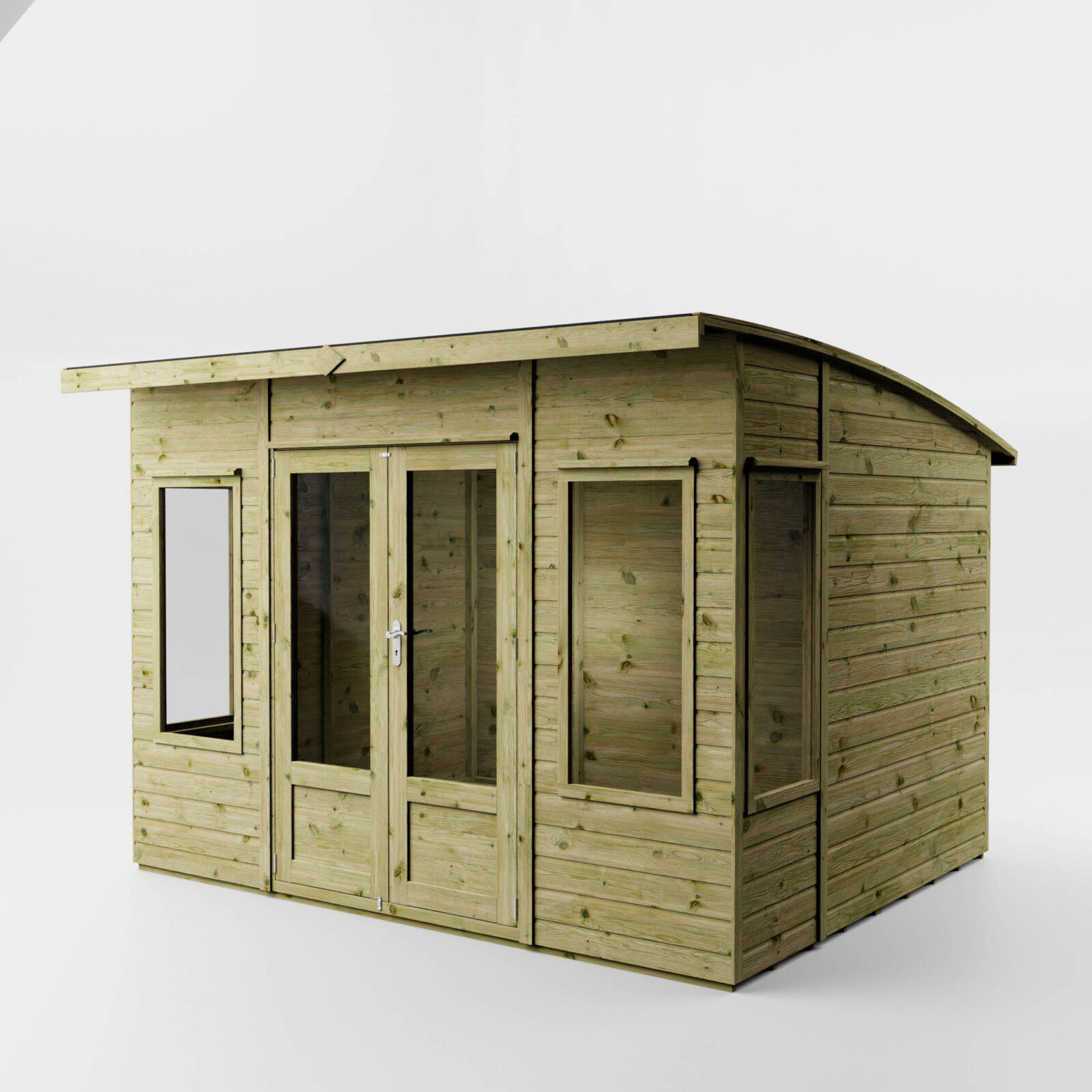 The Mercia 10’x 8′ Premium Helios Green Dipped Treatment Traditional Summerhouse – Curved Roof boasts a stunning, contemporary curved roofline that is sure to become a focal feature within your garden. With styrene glazed windows and French doors, the interior fills with light to create a bright and airy space. Whether you’re looking for an arts and crafts room or somewhere to spend summer evenings, the Helios could be a perfect fit!